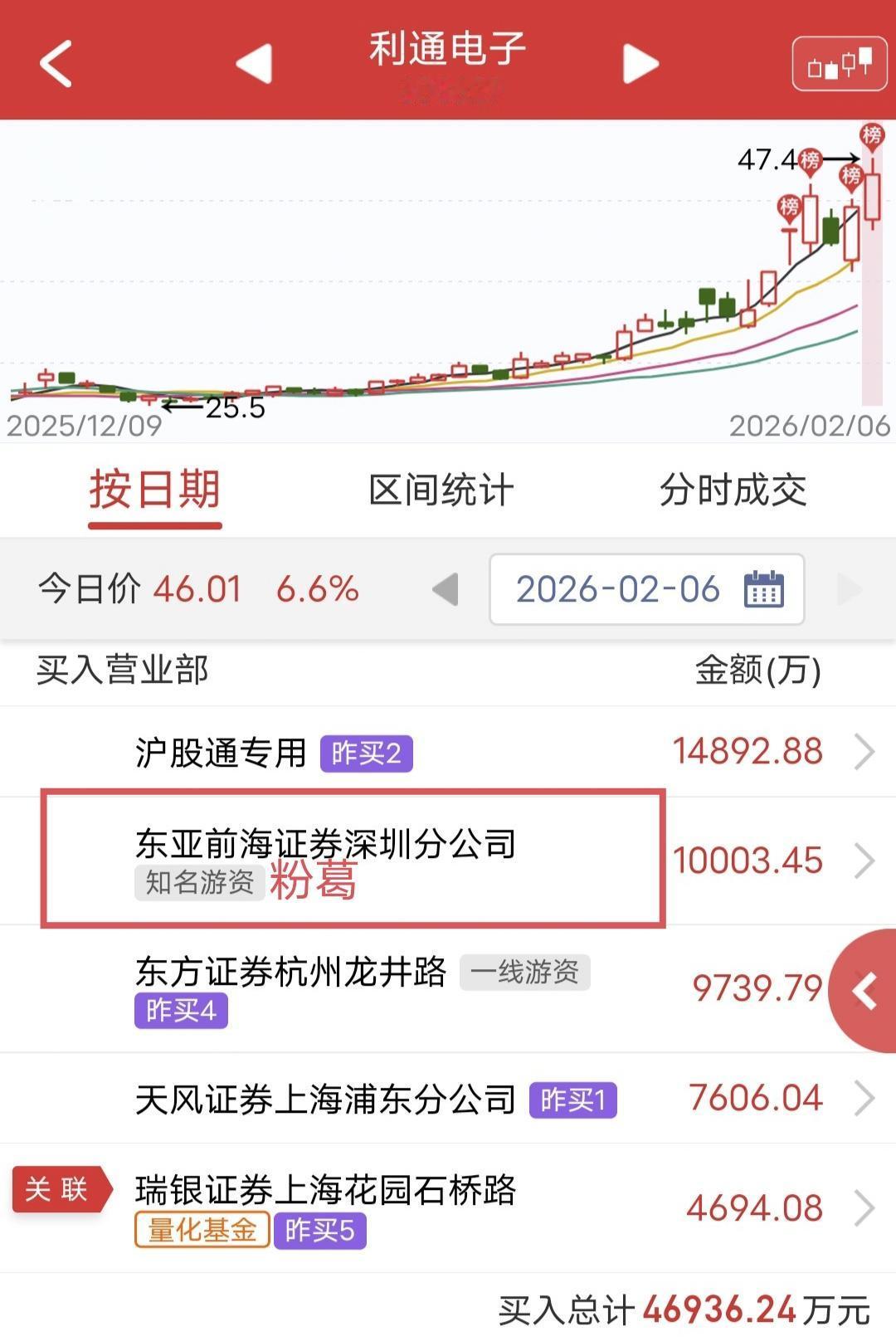 粉葛爆买1.1亿: 今天利通电子上板后炸板。 盘后龙虎榜显示,粉葛爆买1个亿