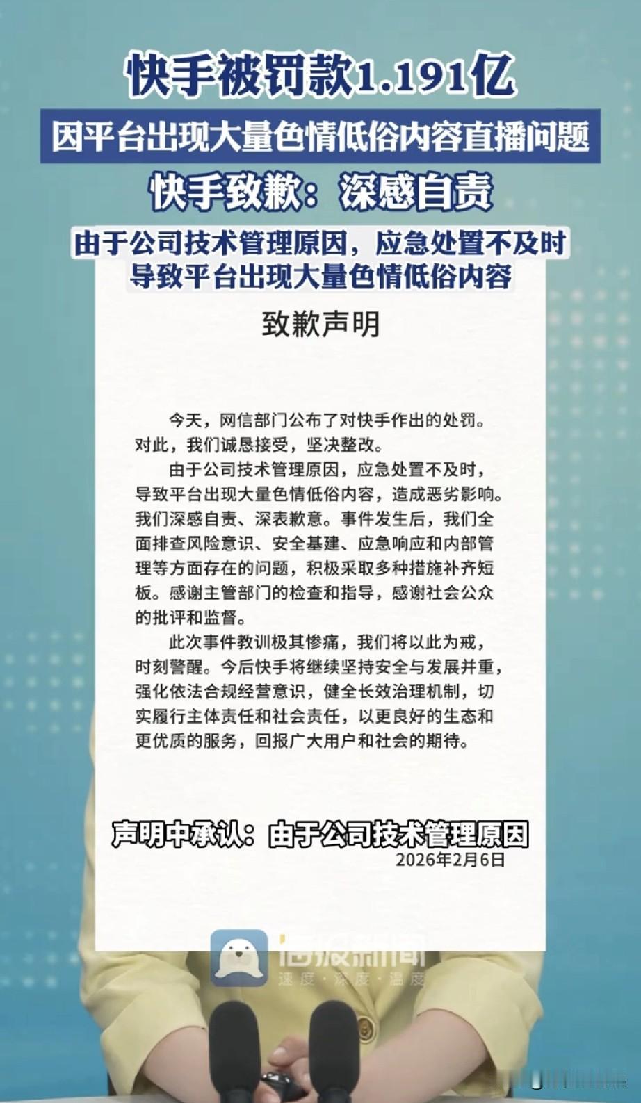 快手因为一场“至暗之夜”,直接被罚掉了1.191亿! 原因是因为去年12月22号晚上,平台被黑灰产疯狂搞事,近2万个僵尸号同时开播,全是不堪入目的色情低俗内容。最绝的是,平台的审核系统居然“睡过头”了,让这些内容足足播了3个小时才被下架! 如今天价罚单落地,快手也公开致歉,称“深感自责”。 讲真,网络不是法外之地,流量再香,也不能不要底线。 这波重罚,大快人心! 你们那晚刷到过没?