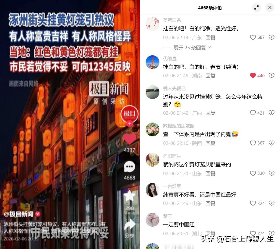 春节挂黄灯笼,市民吵翻天。 原本图个热闹的街头布置,却因为黄灯笼引了争议。