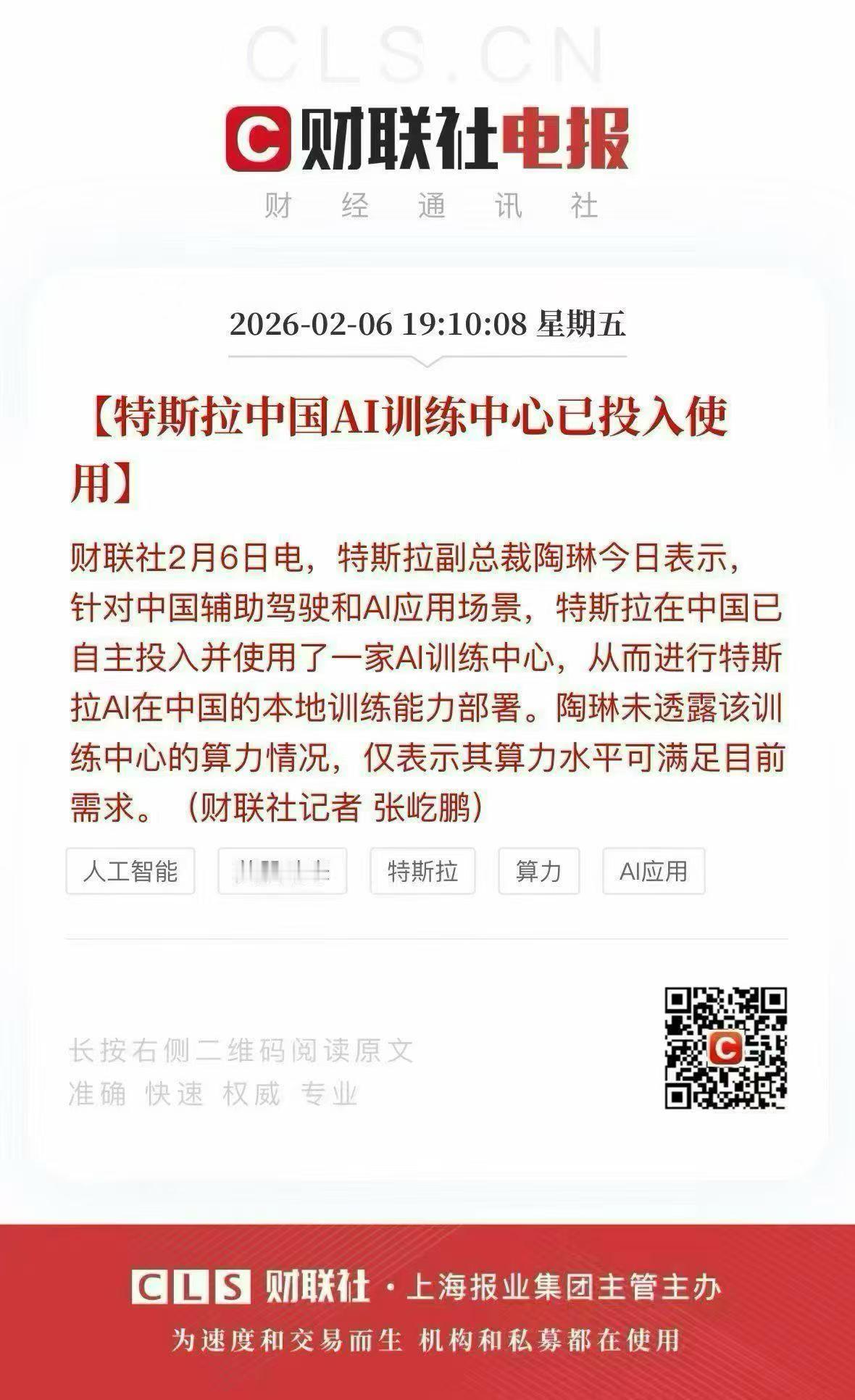 Breakingnews!特斯拉副总裁陶琳:特斯拉中国AI训练中心已投入使用;