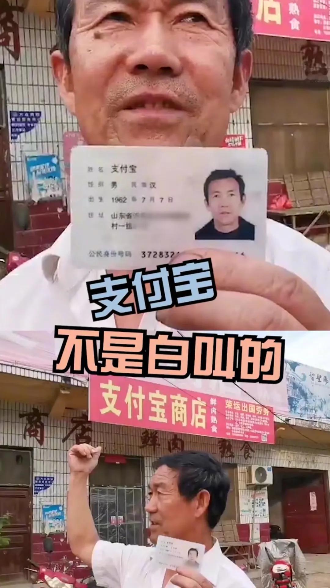 这位大爷真名就叫"支付宝",马云格局真大,竟然给大爷发工资!还给他开了个超市,装修都不用大爷操心!马云全包了,不得不说格局真大!大爷做梦想不到自己会因为这个名字火遍全网,还上了电视,所以说一个名字对人生有多么重要!好好起名吧
