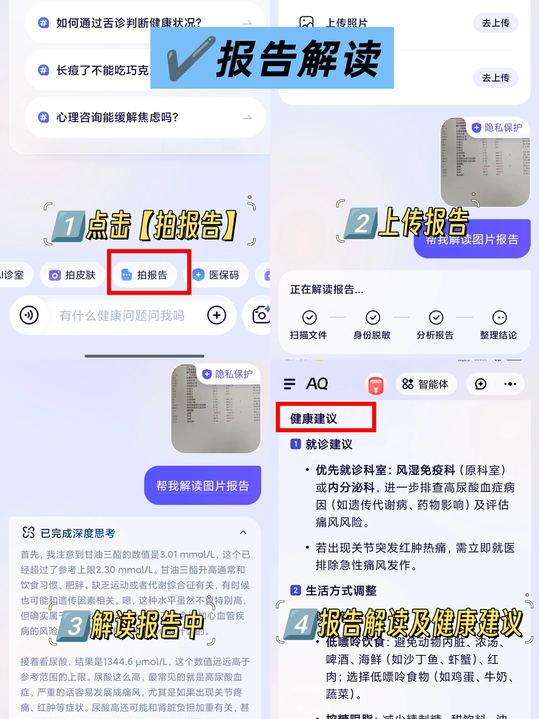 我前段时间测了尿酸但是看不懂报告,找大白👨⚕️又得重新挂号,太麻烦了,我就用它的“拍报告”功能上传报告,然后就得到了各项指标详细易懂的解读,同时还给了我一些健康建议,真的超级方便👍。