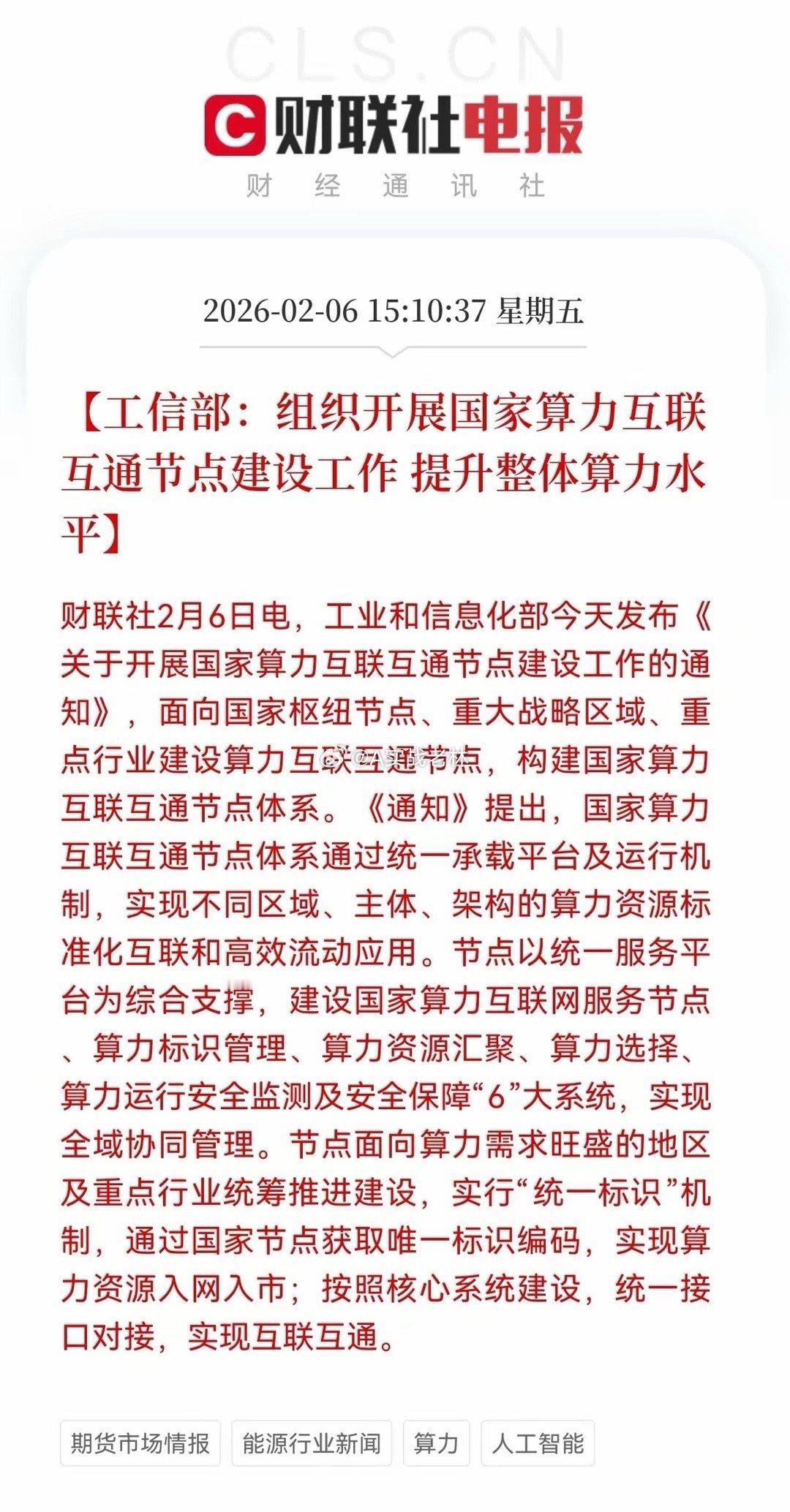 盘后利好!盘后算力板块迎来重大利好,工信部发布关于开展国家算力互联互通节点建设工作的通知,算力基建迎来超级风口。2026年2月6日,工信部一纸《关于开展国家算力互联互通节点建设工作的通知》,为资本市场投下重磅炸弹!这标志着我国算力网络建设正式从“分散建设”迈入“统一调度”的新纪元,一场万亿级的算力基建盛宴已开席。不同于以往单纯的硬件投资,此次政策直击痛点,要在全国建立“算力高速公路”。通过构建统一承载平台和六大核心系统,彻底打通不同区域、不同主体间的算力孤岛。这不仅让“东数西算”从蓝图走向现实,更将催生出一个全新的算力调度与运营服务市场。在这条黄金赛道上,全产业链的投资机会已经清晰浮现。硬件端,服务器龙头中科曙光、浪潮信息将率先受益于节点建设的设备招标;光模块领域,中际旭创、新易盛的高速产品是算力互联的刚需。网络传输层,中兴通讯、烽火通信作为承载网设备核心供应商,订单增长确定性极强。更值得关注的是平台软件与安全服务的长期红利。在算力标识管理、统一调度等核心系统中,中国长城、奇安信等具备技术壁垒的厂商,将从“卖设备”转向“卖服务”,享受持续的运营收益。而三大运营商作为算力网络的建设主体,其资本开支的持续加码,也为整个产业链提供了坚实的业绩底座。随着政策的持续推进,算力互联互通将成为贯穿全年的投资主线。投资者可重点卡位两类标的:一是能快速获得节点建设订单的硬件厂商,二是在六大核心系统中占据技术制高点的平台型企业。这场算力革命,不仅关乎数字经济的未来,更将在资本市场上孕育出下一批十倍股。