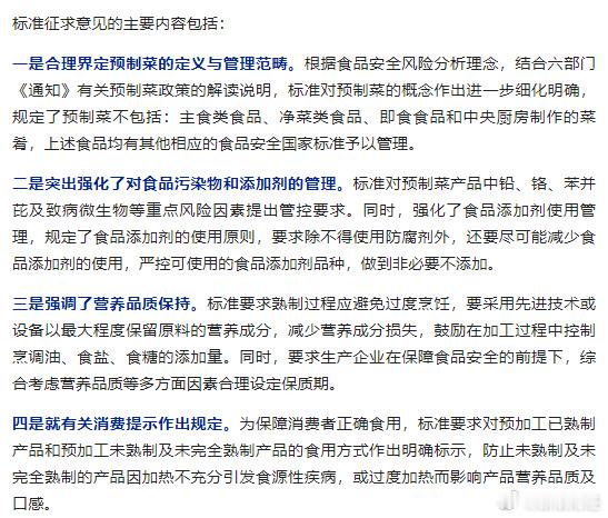 【预制菜术语和分类国标公开征求意见】国家标准《预制菜术语和分类》(征求意见稿)开始公开征求意见。近年来,预制菜产业快速发展,社会各界广泛关注,急需对预制菜产业进行科学规范和有效引导。标准主要分为术语和分类两大部分。在术语部分,共制定了20个术语,包括6个一般术语和14个工艺术语。其中,一般术语原料、辅料、调味料、防腐剂等,主要是对预制菜组成部分、配料构成进行细化阐释。工艺术语分切、搅拌、滚揉、炒制、炸制、烤制等,主要是从工艺加工流程、加工方式等方面对主要术语进行解释。在分类部分,主要考虑与现行食品安全相关标准法规的衔接,将预制菜从主要原料、预制工艺、贮运方式、包装方式、食用方式等不同维度进行了划分。预制菜不包括四类食品