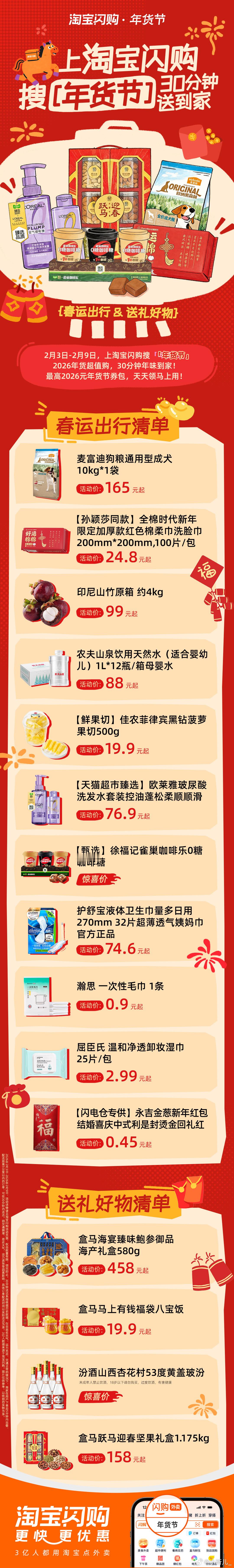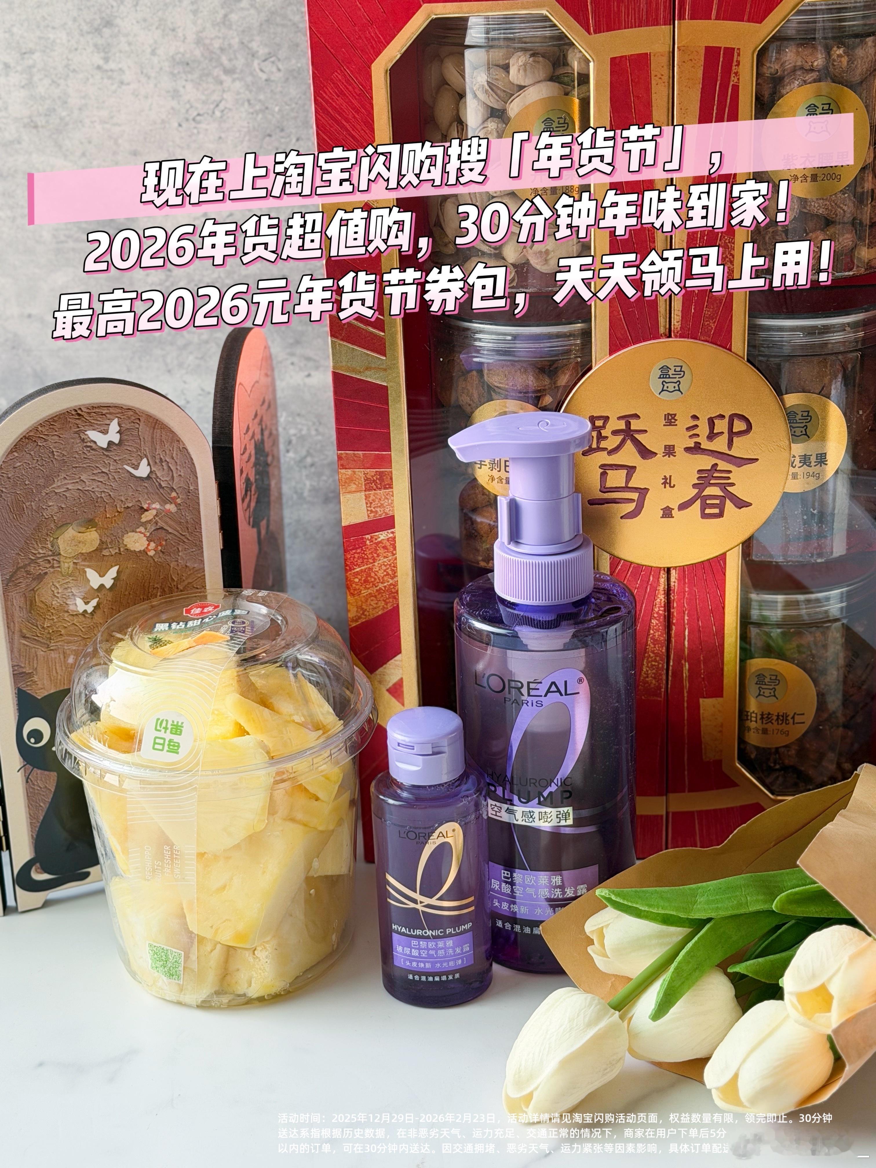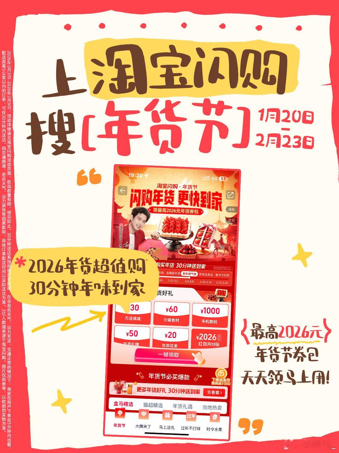 快递停运 重塑春节社交语言,当你说年货马上到,30分钟年味就真的到家!上淘宝闪购搜「年货节」,还有最高2026元年货节券包,天天领就能马上用!马年的关键词,我们主推就是一个速速淘宝闪购年货节你的春运好搭子淘宝闪购年货节