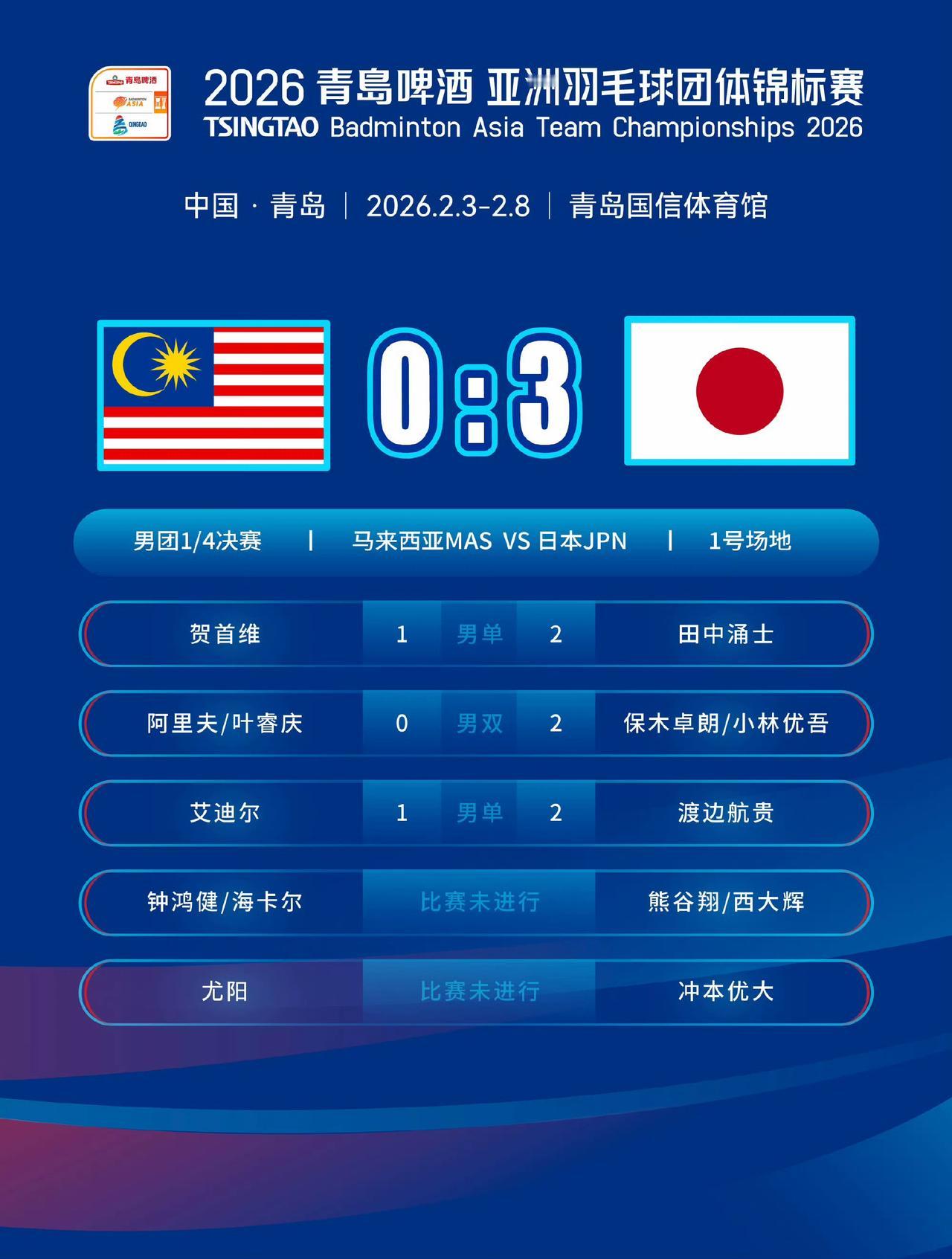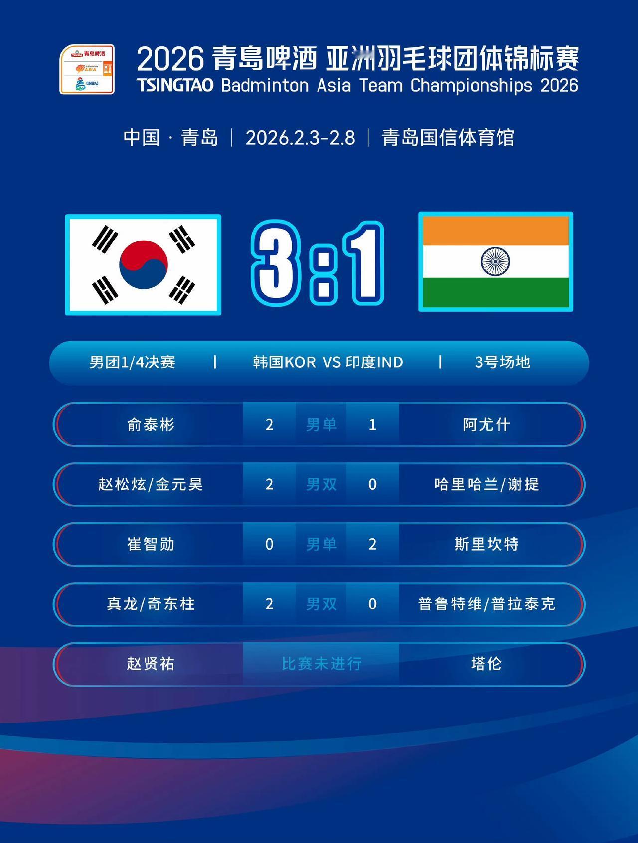 男团 1/4 决赛今日在青岛落幕,国羽男团以 3-1 击败中国台北队晋级四强。此外韩国 3-1 战胜印度、日本 3-0 横扫马来西亚、印尼 3-2 险胜泰国,这四支队伍也携手晋级半决赛。