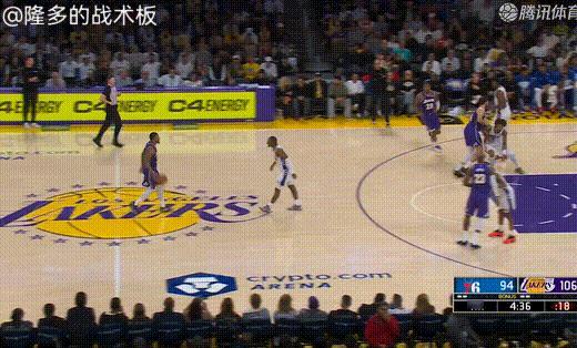 【湖人战术】牛角落位的另一个打法,里夫斯为詹姆斯做背掩护,给他创造快速切入的空间,詹姆斯防守人VJ的注意力都在持球人身上,此时格莱姆斯意识到要换防已经来不及了,另外里夫斯跑出来也创造一个外线威胁。