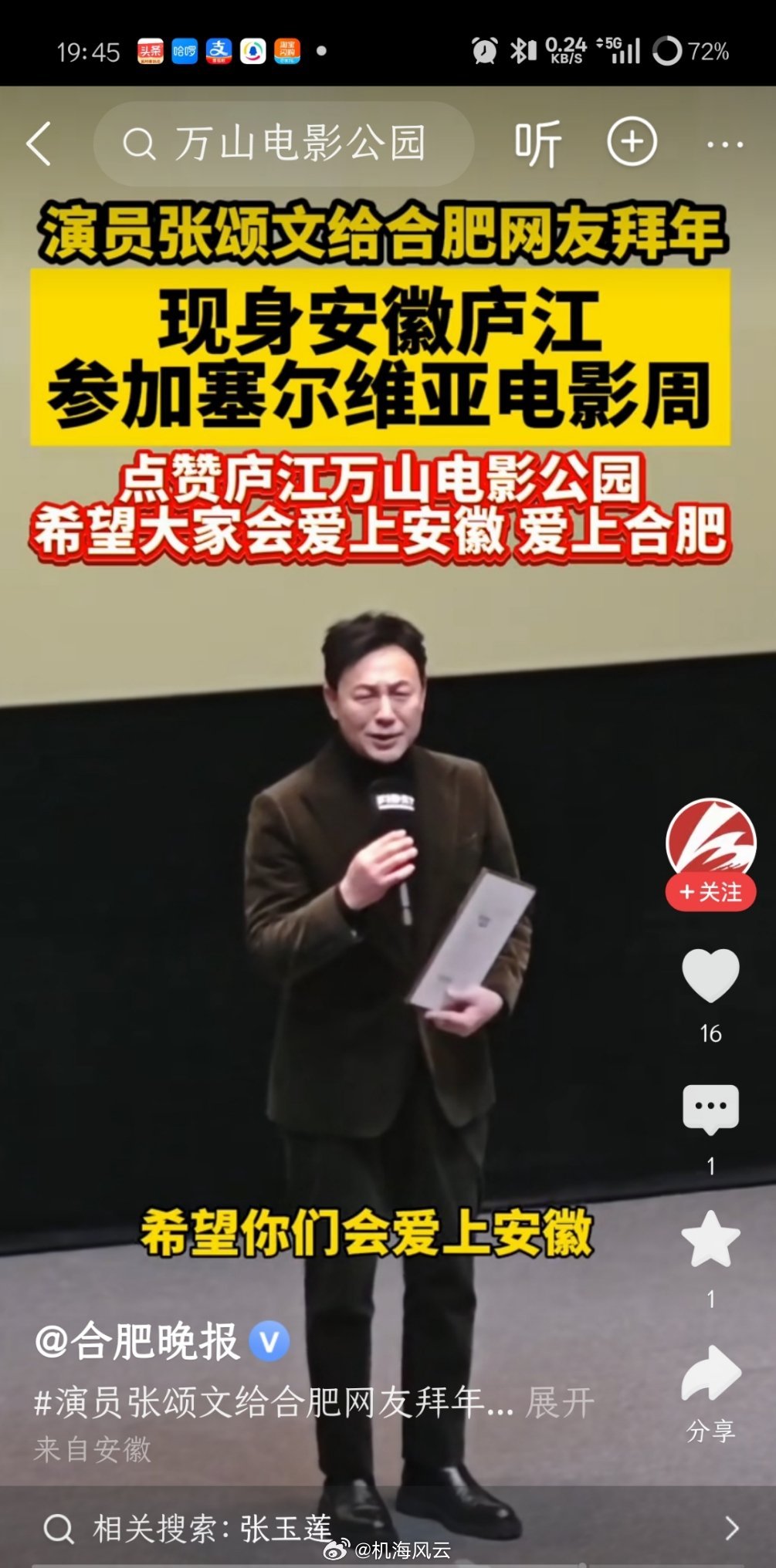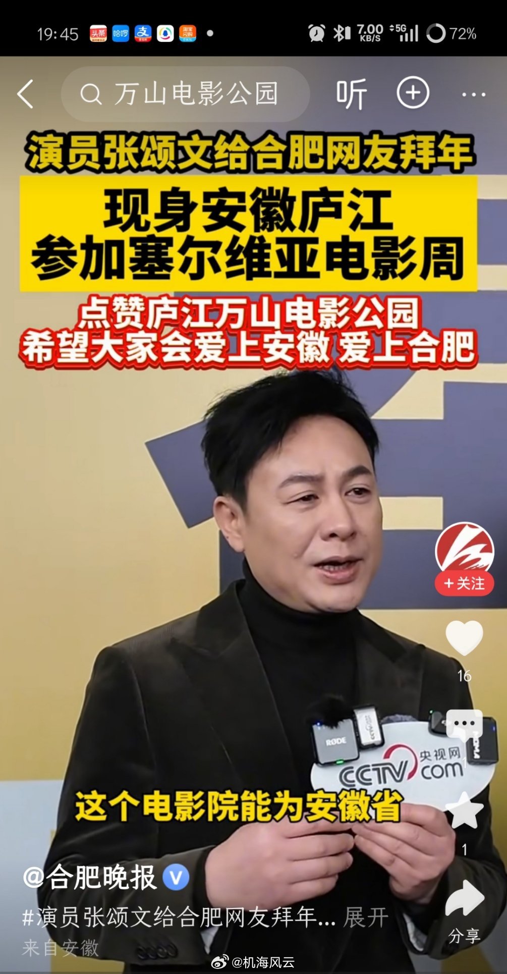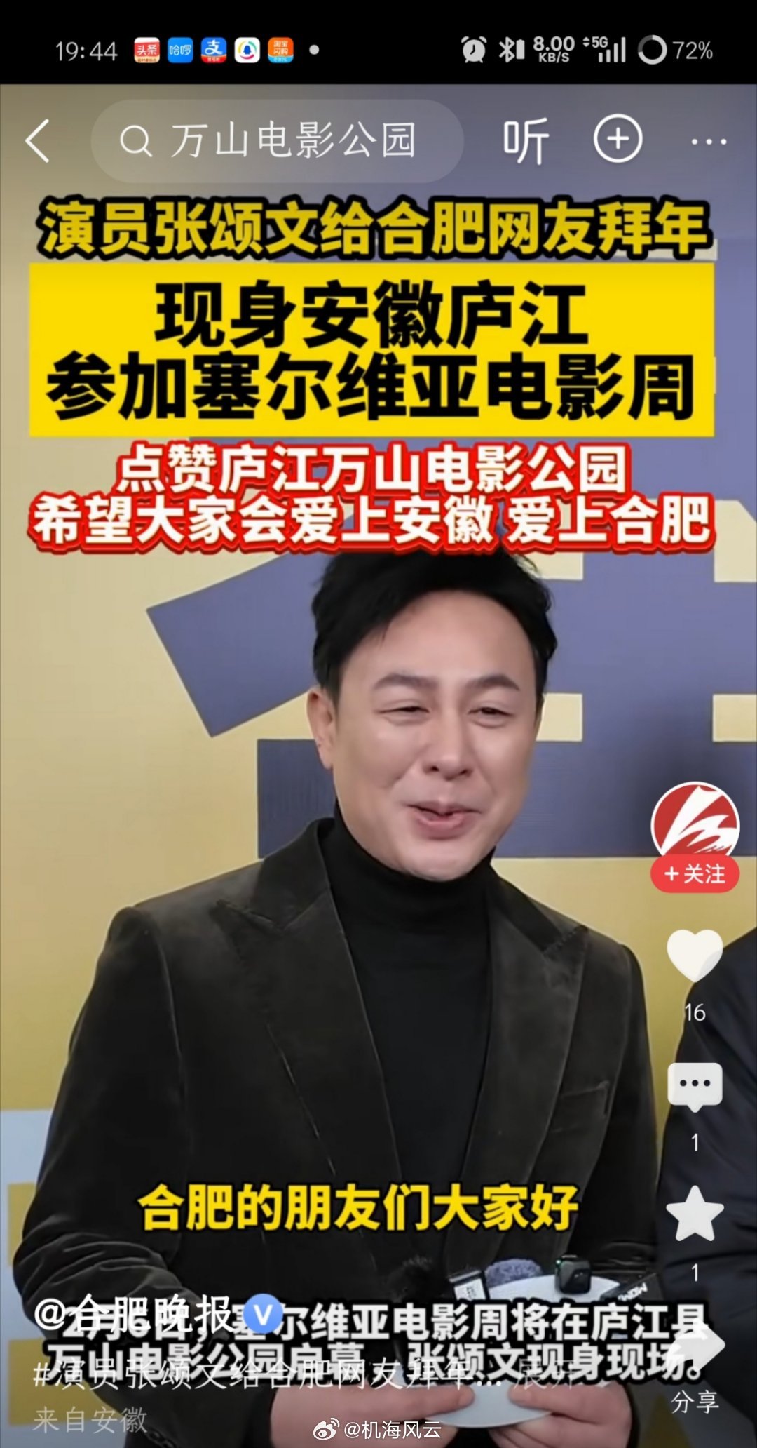哟!张颂文受邀去合肥庐江参加塞尔维亚电影周活动了,看了央视网的采访片段,张老师除了给合肥朋友带去新年问候外,他还不忘为安徽打Call,格局啊