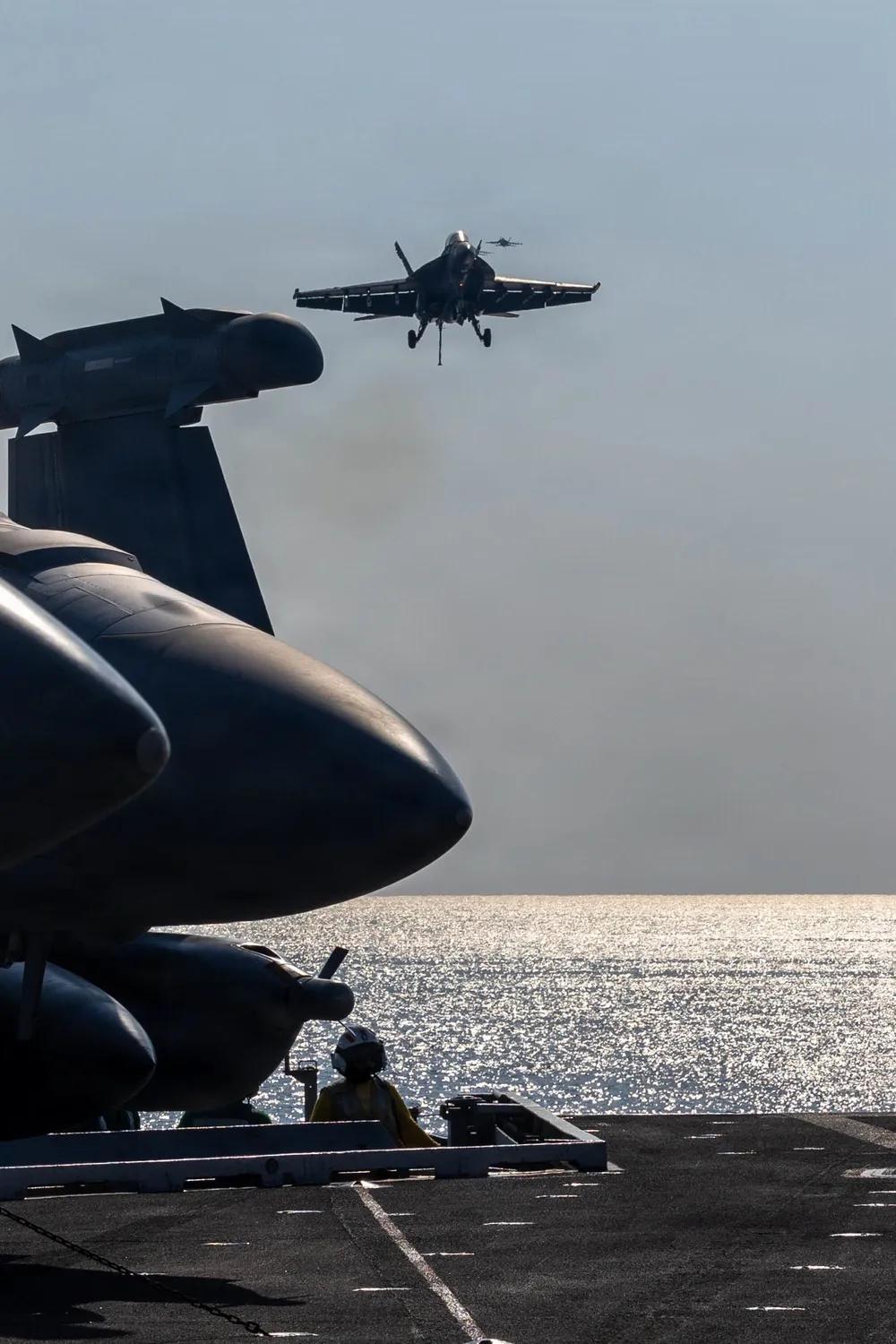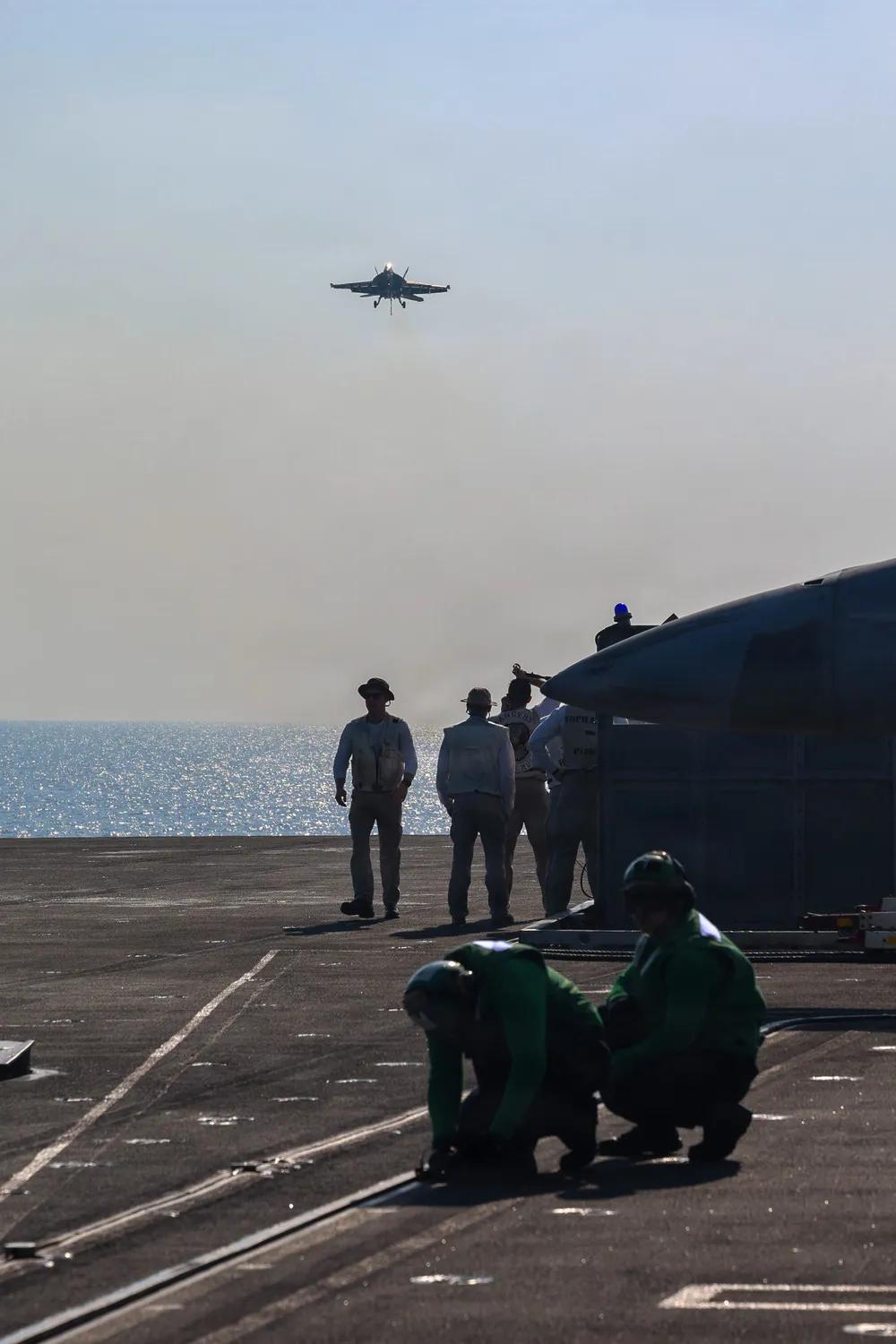 中美之间航母已经没有太大的技术差别,而中国在电磁弹射领域可以说领先美国。 2026年1月30日,阿拉伯海,美军进行威慑伊朗的行动中,一架隶属于第41攻击战斗机中队(VFA 41)的F/A-18F超级大黄蜂,在阿拉伯海尼米兹级航空母舰亚伯拉罕·林肯号(CVN 72)的飞行甲板上进行受阻着陆。 亚伯拉罕·林肯号部署至美国第五舰队作战区,支持美国中央司令部责任区的海上安全与稳定。