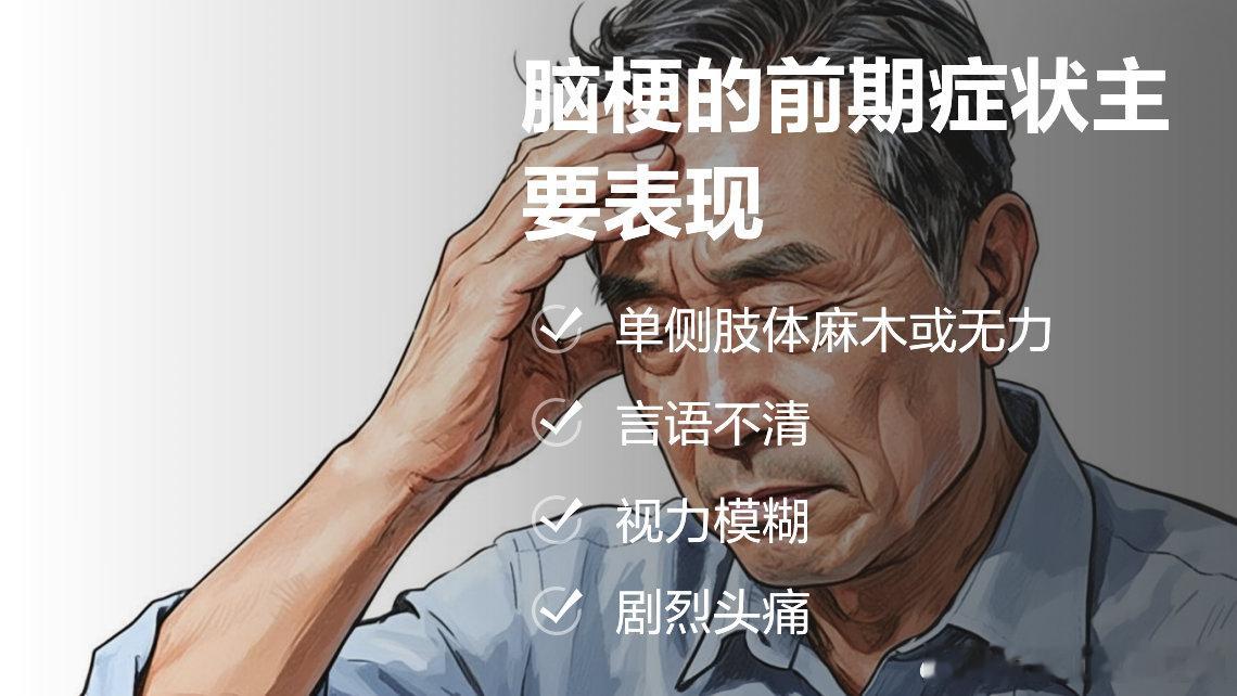 脑梗的早期并不总是头晕和剧烈的胸痛。反复出现的单侧肢体麻木、无力,言语不清、说话含糊,眼睛黑朦,面部不对称和口角歪斜,以及频繁的呛咳和吞咽困难,都是脑梗的早期信号。