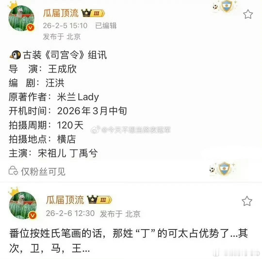 网传《司宫令》是丁禹兮宋祖儿两人平番,现在双方的粉丝都很不满意这个番位安排,正在维权