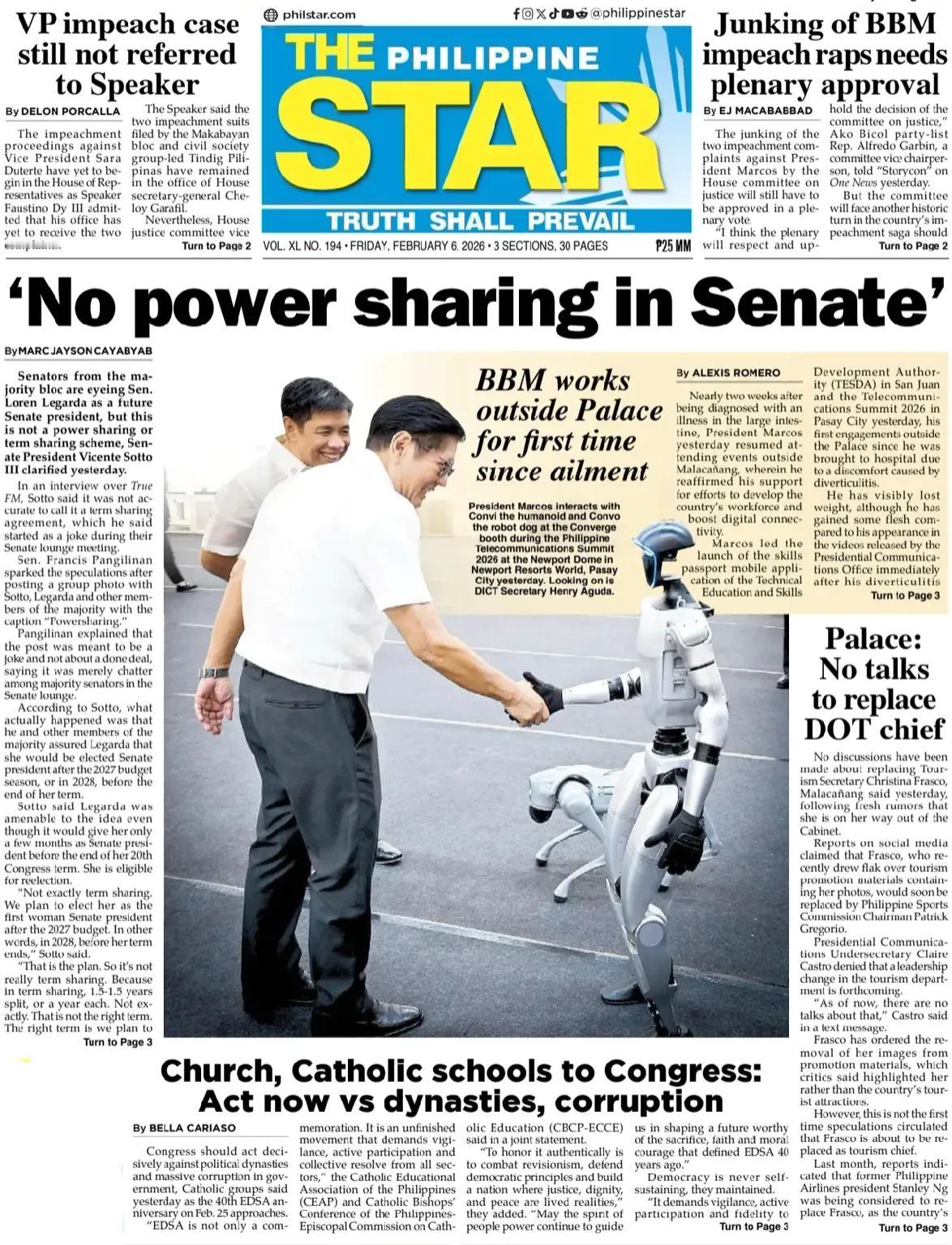 《菲律宾星报》头版报道,照片显示,自患病以来,小马科斯总统首次在总统府外开展活动。 昨天,在帕赛市纽波特环球度假村的纽波特穹顶举行的2026年菲律宾电信峰会上,总统小马科斯在Converge展位与仿人机器人康维(Convi)和机器狗康沃(Convo)互动。一旁观看的是信息通信技术部部长亨利·阿古达(Henry Aguda)。 用了中国宇树机器人公司的产品却不敢在报纸上说机器人来自中国,还以为是菲律宾制造出来的机器人,可见菲律宾国内政治非常诡异。
