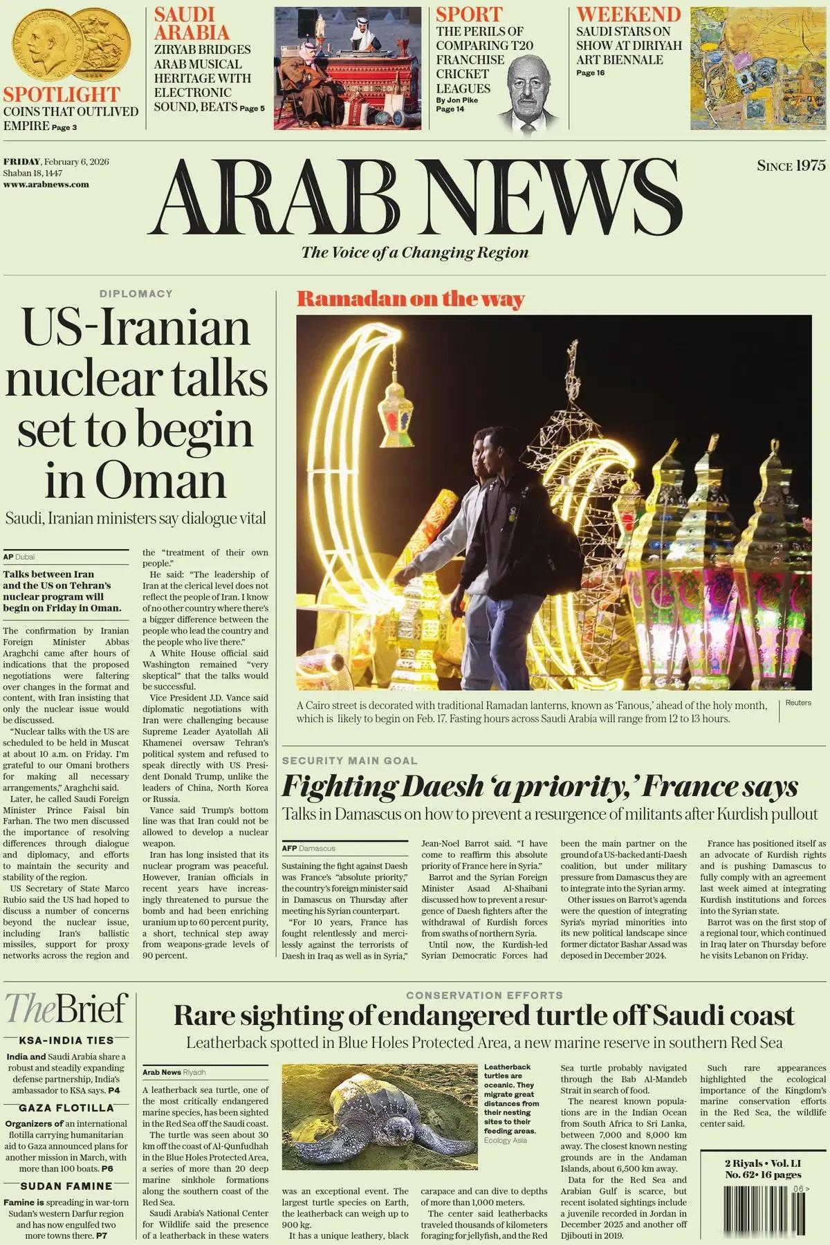 尽管美伊局势紧张,但是阿拉伯国家总体希望伊朗与美国能够和平对话化解矛盾。因为战事一开,倒霉的就是这些国家以及能源市场,本国安全。 《阿拉伯新闻》头版报道称,美伊核谈判将在阿曼举行 ,沙特和伊朗部长称对话至关重要。 伊朗与美国就德黑兰核计划的谈判将于周五在阿曼举行。 伊朗外长阿巴斯·阿拉格希证实了这一消息。此前数小时有迹象表明,拟议中的谈判在形式和内容的变化上陷入僵局,伊朗坚持只讨论核问题。 阿拉格希说:“与美国的核谈判定于周五上午10点左右在马斯喀特举行。我感谢我们的阿曼兄弟做出了所有必要安排。” 后来,他致电沙特外交大臣费萨尔·本·法尔汉亲王。两人讨论了通过对话和外交解决分歧的重要性,以及维护地区安全与稳定的努力。 美国国务卿马尔科·卢比奥表示,美国原本希望讨论核问题之外的一些关切,包括伊朗的弹道导弹、对该地区代理网络的支持以及伊朗国内政治问题。 一些阿拉伯国家,如沙特阿拉伯、阿联酋等,曾在公开场合强调通过外交途径解决争端,呼吁各方保持克制,避免地区局势升级。例如,沙特官方多次表示“绝不允许别国使用其基地攻击邻国”,并倡导“和平解决分歧”‌。这种立场部分源于对地区稳定和经济安全的考量,避免战争对能源市场和本国安全造成冲击。