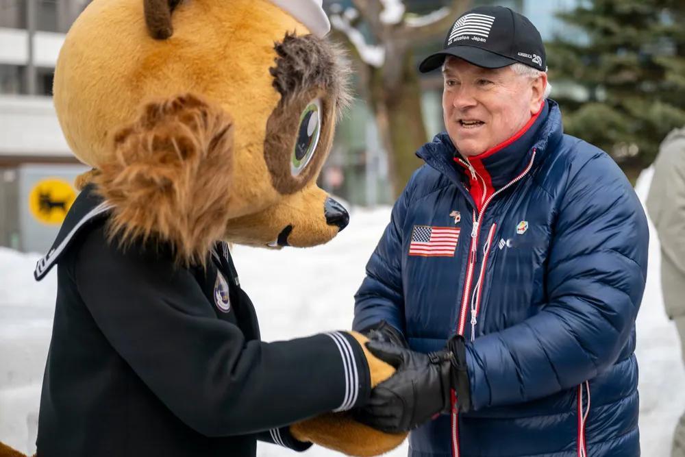 日美之间又在“秀恩爱”。 日本 - 美国驻日本大使乔治·格拉斯(右)、三泽海军航空设施(NAF)指挥官杰里米·N·莱昂上尉和玛丽·格拉斯在第76届札幌雪祭期间与横须贺舰队活动司令(CFAY)吉祥物横本合影。 每年约许多人来自世界各地的游客前来观看数百件雪雕和冰雕。这是美国海军第41次参加该节日,为水手们提供了一个独特的机会,体验日本文化和传统,同时加强了美国海军与日本公民之间的紧密友谊。