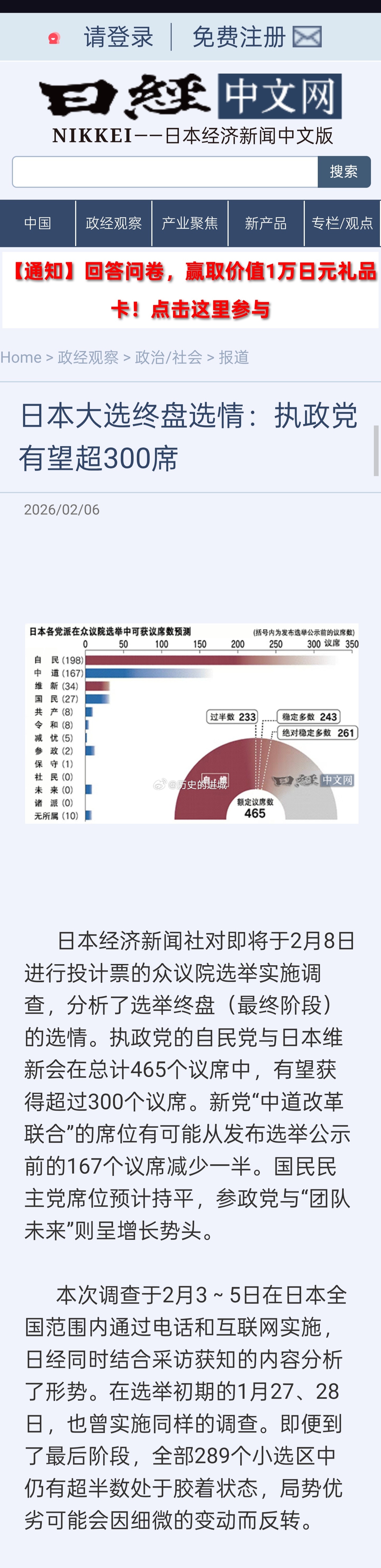 日经新闻吹自民党与日本维新会在2月8日进行投计票的众议院选举中有望在465个议席中获得超过300个议席。不仅超过半数233个议席,也超过了261议席的“绝对稳定多数”,将确保在所有常任委员会中占据过半数席位,并垄断委员长职位。
