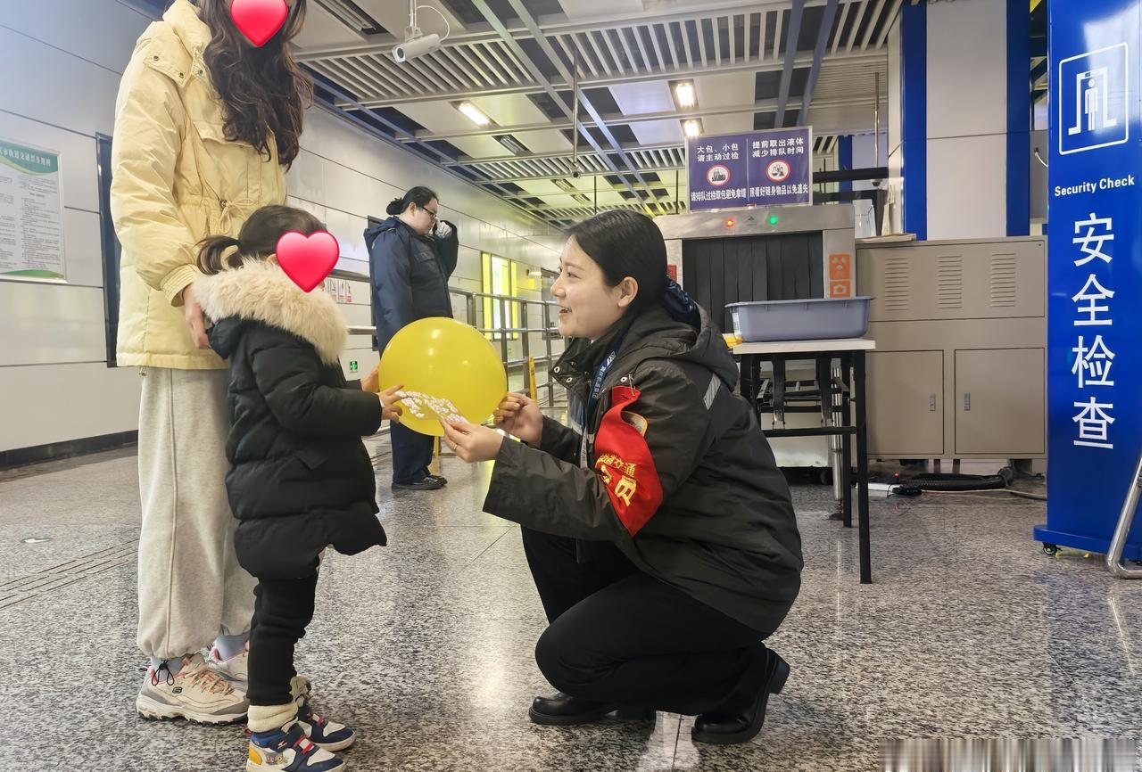 携带气球的小朋友正与车站工作人员交换小礼物。小朋友们请注意,气球是不能带进轨道交通车站乘车的哦~[心][心](图/运营三分公司 文美莹)