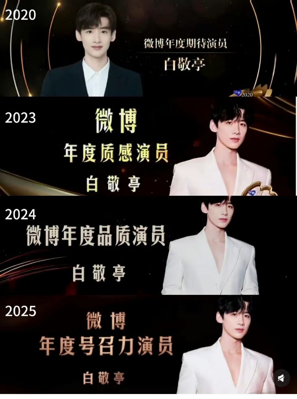 白敬亭微博之夜获奖经历,从年度期待演员再到年度号召力演员高荣誉,每一部都算数