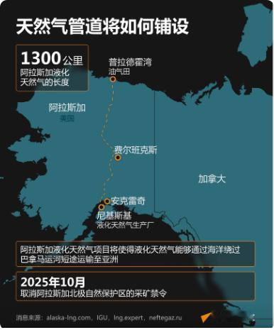 在阿拉斯加建造天然气管道 日本为向亚洲国家进口美国能源投资建造阿拉斯加液化天然气管道。阿拉斯加液化天然气项目将使得液化天然气能够通过海洋绕过巴拿马运河短途运输至亚洲。欲知详情,请浏览卫星通讯社视频图解。 去年 3 月,特朗普曾表示,美国的合作伙伴 – 包括韩国和日本 – 计划投资数万亿美元建设阿拉斯加输气管道。 今年 2 月,日本首相石破茂称,该国对美国能源的稳定供应感兴趣。他特别提到,阿拉斯加正在开发一个新气田。为了让日本能从那里获取天然气,需要建设一条输气管道,但这将使日本有望从邻近来源获得稳定的供应。