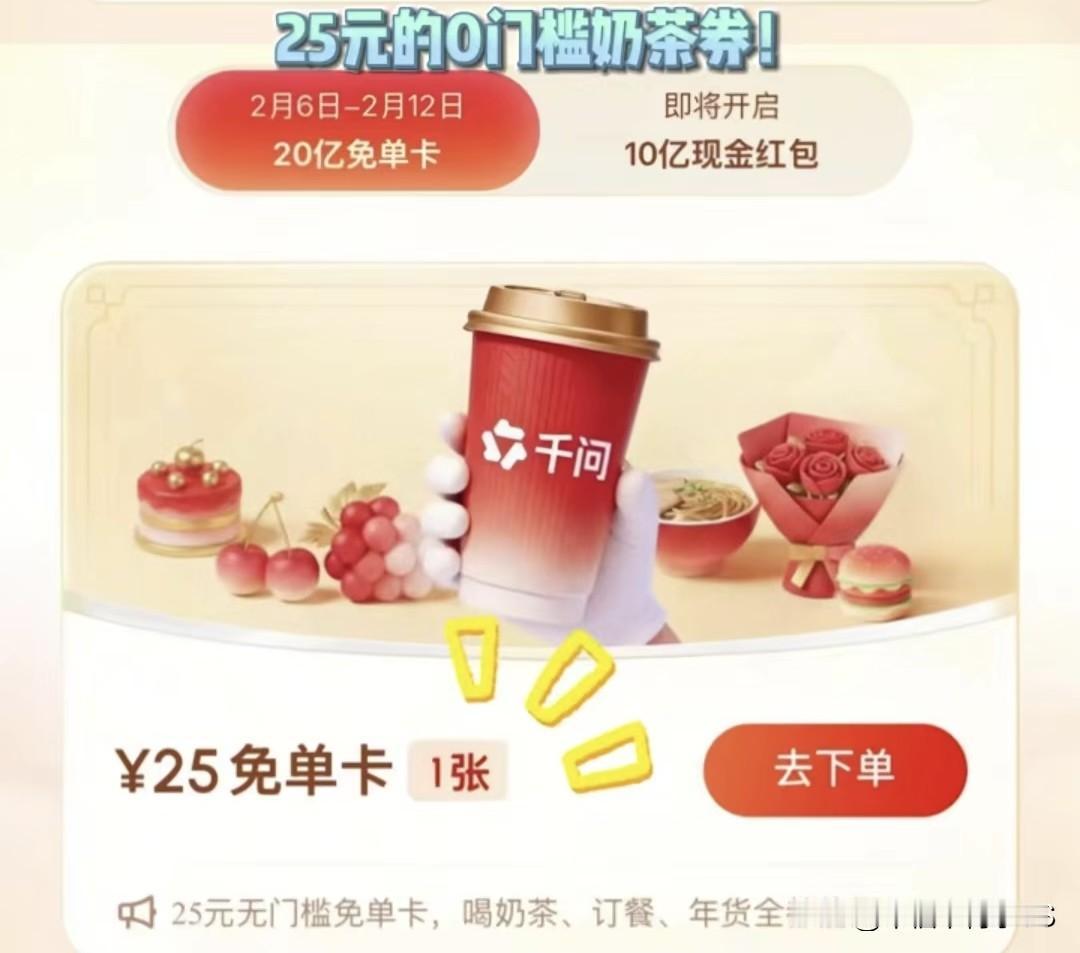 以前外卖大战薅羊毛,现在新春AI大战,千问请大家喝奶茶,2月6日-2月12日,打开千问APP升级到最新版本,就能领一张25元无门槛奶茶券,点奶茶、订餐、买年货都能用,通过对话页面下单,奶茶直接0.01元拿下! 这还不算完,邀请一个新朋友下载千问APP,双方都能得一张25元免单卡,最多能得21张,算算这得有525块呢,这下直接把奶茶店的店员干崩溃了,单多到根本做不完。 累计邀请3个好友,还能抽价值万元的千问AI生活卡。2月13日之后,最高2888元现金红包也安排上了! 这羊毛,你们耗上了吗?