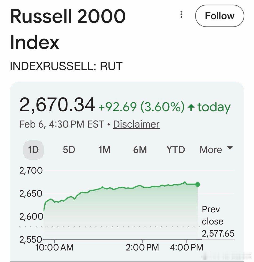 今天美股:道琼斯📈2.47%,标普500📈1.97%,纳斯达克📈2.18%,罗素2000📈3.6%