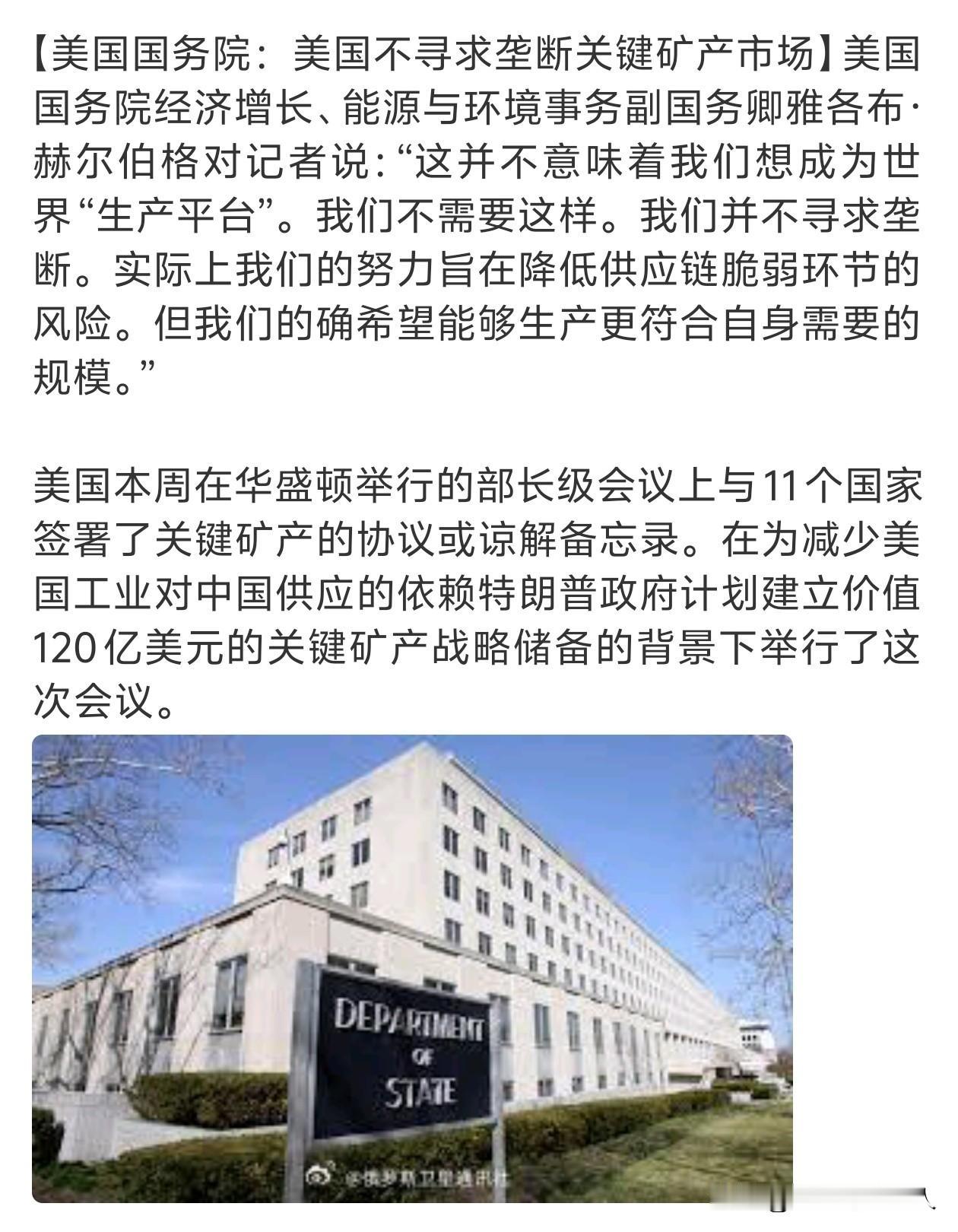 呵呵! 最新态度!美国国务院:美国不寻求垄断关键矿产市场。 各位,这句话该怎么理解?难道是缓兵之计?[捂脸]