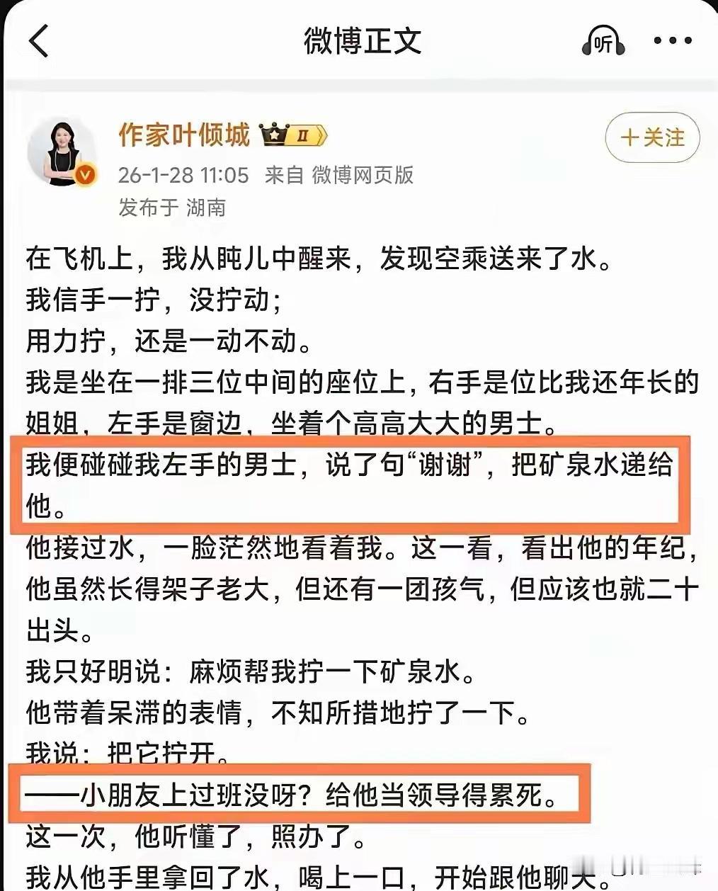 瞧见多人在说叶倾城“油腻、女登”,仔细看其发文内容,真不至于获此“美誉”。 人,不了解,查了,居然和棉棉、卫慧、木子美同时代。按网评,作品很出色,不过,木子美的印象分更强。 叶是女作家,有女性通病,网传截图内容倒显撒娇味道。这事吧,真不必上纲上线,不过,还是得调侃下叶女士,送句经典语录,图一乐。 “一个女人,在某个年龄必须美丽才会被爱,而到了另一个年龄,则必须被爱才美丽。”