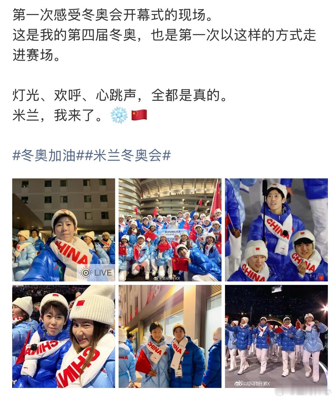 冬奥加油v观冬奥会体育大拜年 参加完开幕式的范可新说到【第一次感受冬奥会开幕式的现场。这是我的第四届冬奥,也是第一次以这样的方式走进赛场。灯光、欢呼、心跳声,全都是真的。米兰,我来了。❄️🇨🇳】