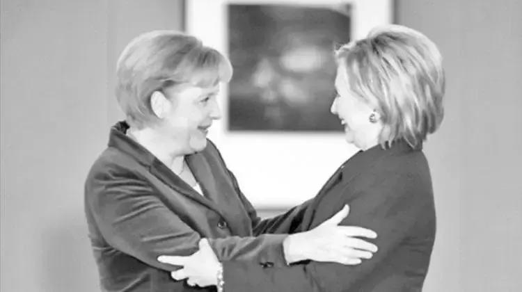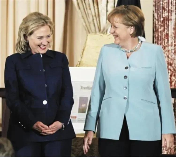 三个女人一台戏。 两个女人酒逢知己千杯少。 希拉里和默克尔,一个眼神犀利,给人疏离感;一个笑容温暖,更具亲和力。她们共有一头金色短发,同穿蓝色系衣服,都是美呆又酷飒。 一见面说不完的悄悄话。 希拉里也会羞答答,估计是默克尔把她的心事猜中了。