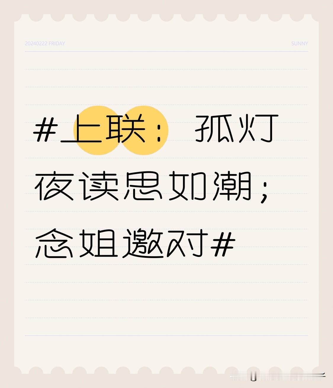 看到这个上联“孤灯夜读思如潮”,瞬间就感觉有画面感了,一个人在孤灯下夜读,思绪如潮水般翻涌。我来对个下联“冷月晨吟意似浪”。 “冷月”对应“孤灯”,都是营造一种清冷的氛围。“晨吟”和“夜读”时间上有对比,一个早晨吟诗,一个夜晚读书。“意似浪”对“思如潮”,都是形容思绪情感像潮水波浪一样澎湃。感觉还挺对仗的,不知道大家觉得我对得咋样,欢迎一起探讨呀!