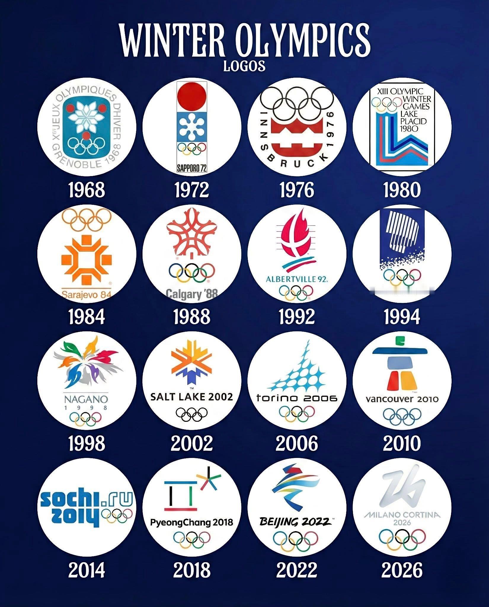 1.🇫🇷1968年 – 法国,格勒诺布尔2.🇯🇵1972年 – 日本,札幌3.🇦🇹1976年 – 奥地利,因斯布鲁克4.🇺🇸1980年 – 美国,普莱西德湖5.🇾🇪1984年 – 萨拉热窝,南斯拉夫(今:波黑🇧🇦)6.🇨🇦1988年 – 加拿大,卡尔加里7.🇫🇷1992年 – 法国,阿尔贝维尔8.🇳🇴1994年 – 挪威,利勒哈默9.🇯🇵1998年 – 日本,长野10.🇺🇸2002年 - 美国,盐湖城11.🇮🇹2006年 – 都灵,意大利12.🇨🇦2010年 – 加拿大,温哥华13.🇷🇺2014年 – 俄罗斯,索契14.🇰🇷2018年 – 韩国,平昌15.🇨🇳2022年 – 中国,北京16.🇮🇹2026年 – 米兰–科尔蒂纳丹佩佐,意大利
