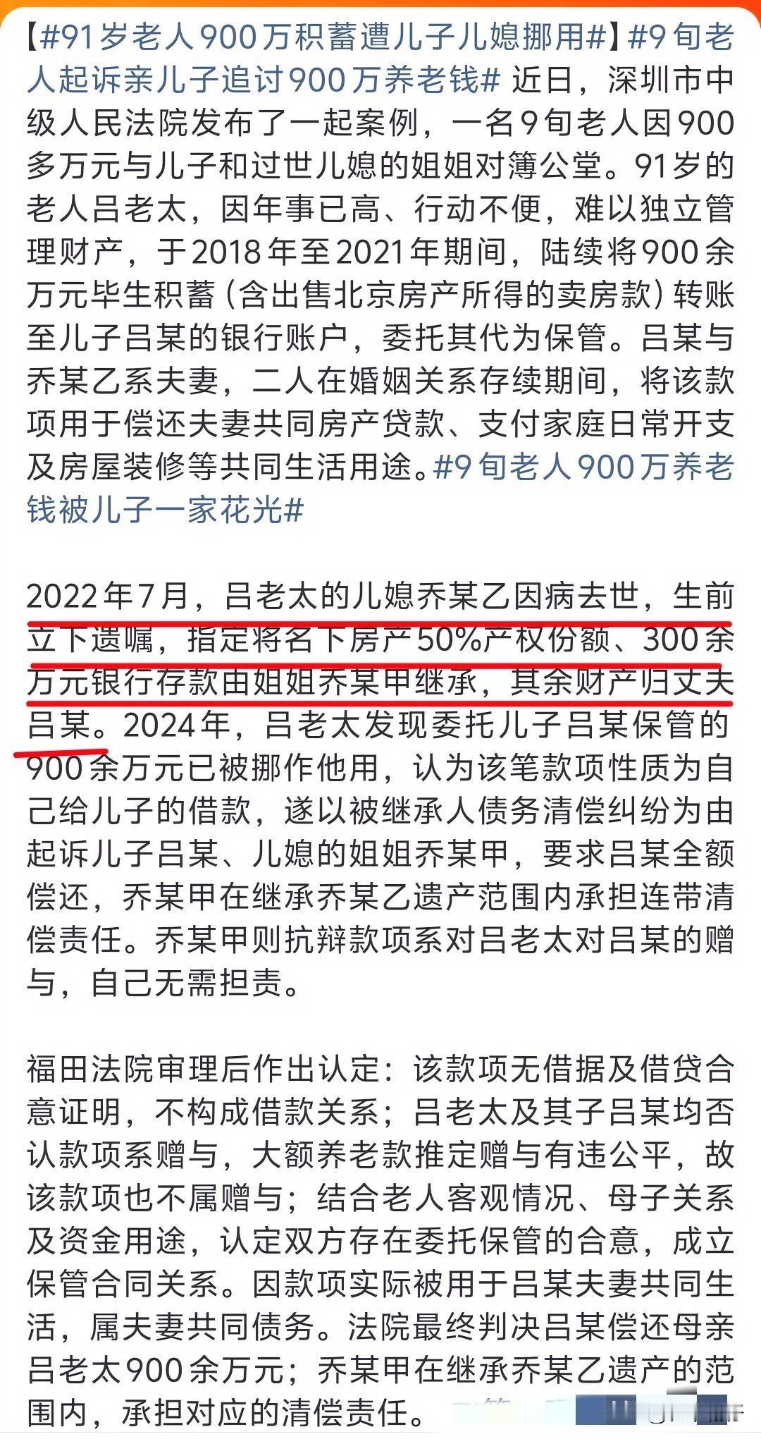近日,深圳市中级人民法院发布了一起案例,91岁的吕老太将900余万元毕生积蓄委托儿子保管,不料这笔钱被儿子儿媳擅自用于家庭开销、房产还贷等用途。更令人意外的是,儿媳在病逝前竟将部分财产遗赠给自己的亲姐姐。老人最终通过法律途径成功追回全部款项。 离谱,儿媳妇遗产如果给孙子,孙女,我觉得正常。给姐姐,你自己赚的倒也无所谓,你拿老人家的钱给?这就是这个儿子想把钱从大姨子那要要回来的正常法律操作,而不是老太和儿子闹掰了,不是伦理问题。奇怪这儿媳妇病逝了,分一半钱给自己姐姐这是干啥?她没孩子吗? 真正值得讨论的,并非遗产分配的对象问题,而是儿子儿媳将老人巨额养老钱视为自家财产肆意支配的行为。从擅自挪用到写入遗嘱分配,这已不仅是简单的“啃老”,更是对他人财产的明目张胆侵占。法院的判决不仅厘清了家庭财产托管的法律边界,也揭示出亲情信任背后的伦理危机。 即便是在至亲之间,财产委托也需明晰权责。 9旬老人起诉亲儿子追讨900万养老钱