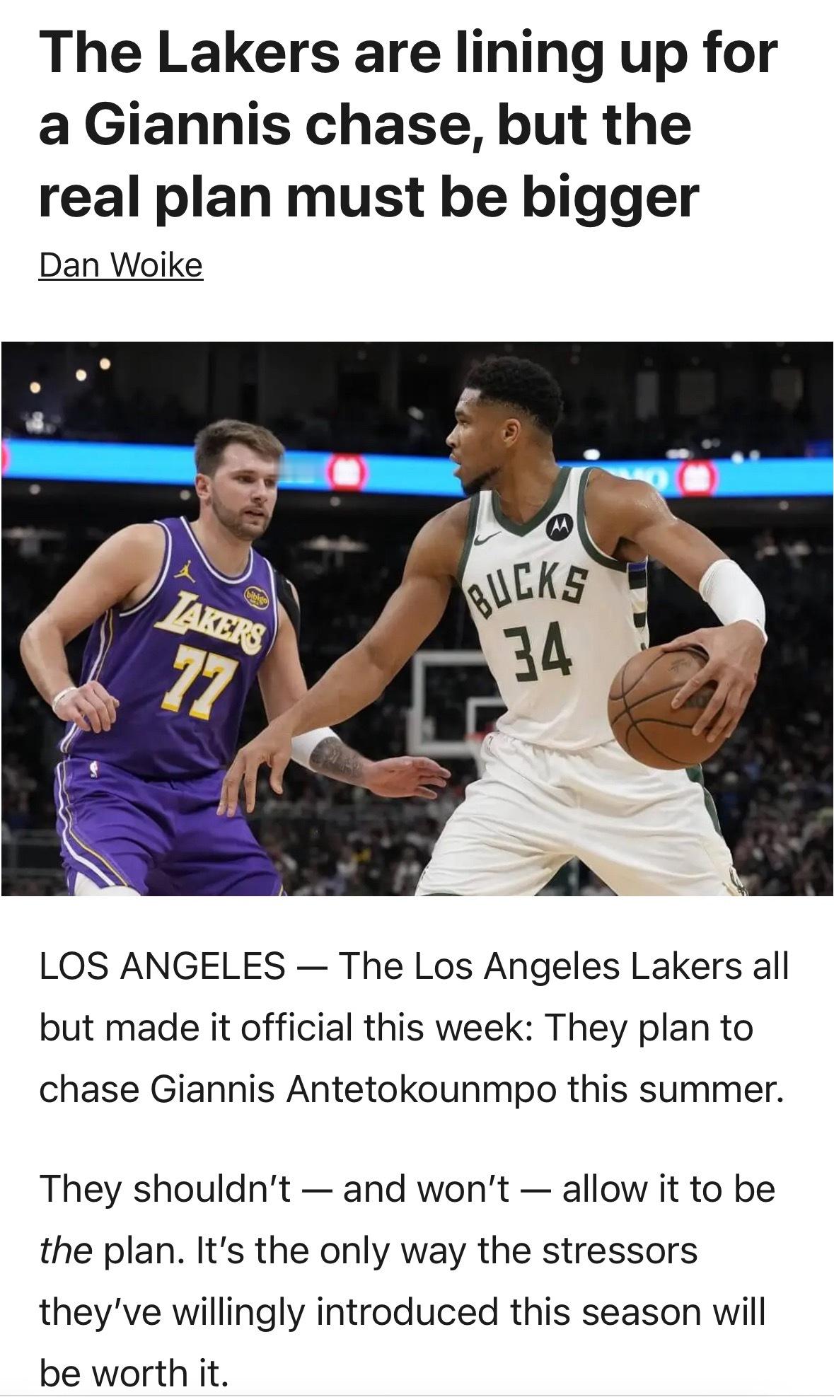 湖人记者Dan Woike:湖人本周几乎已将此事敲定:他们计划在今夏追逐字母哥。