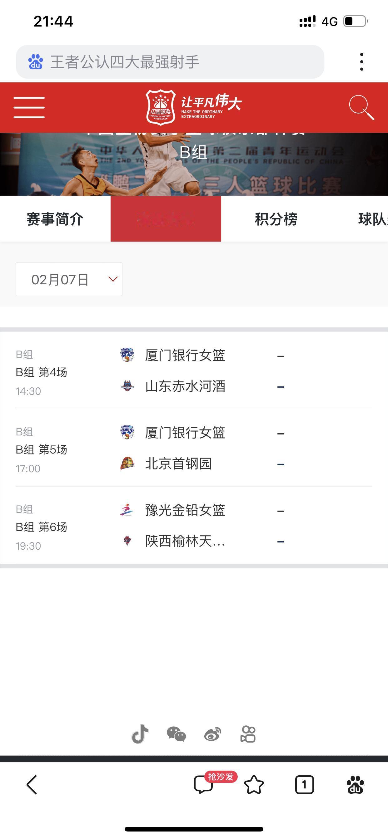 WCBA俱乐部杯预赛的第二日安排👇 14:30,有三场比赛,分别是大连女篮VS武汉女篮,武汉女篮昨天被合肥女篮以下克上,大连女篮昨天与山西女篮鏖战了三节多点。 浙江女篮VS东莞女篮 厦门女篮VS山东女篮 17:00,合肥女篮VS上海女篮,上海女篮昨天算是险胜石家庄女篮。 新疆女篮VS江苏女篮,这一次,新疆女篮和江苏女篮一样,没有全主力出战 四川女篮VS北京女篮,看全华班四川女篮能否击败拥有三外援的北京女篮? 19:30,石家庄女篮VS山西女篮,看石家庄女篮能否再胜山西女篮一场? 福建女篮VS江西女篮 河南女篮VS陕西女篮,看河南女篮能否提前预演一场胜利的季后赛,因为季后赛排位大战,她们俩就是对手。
