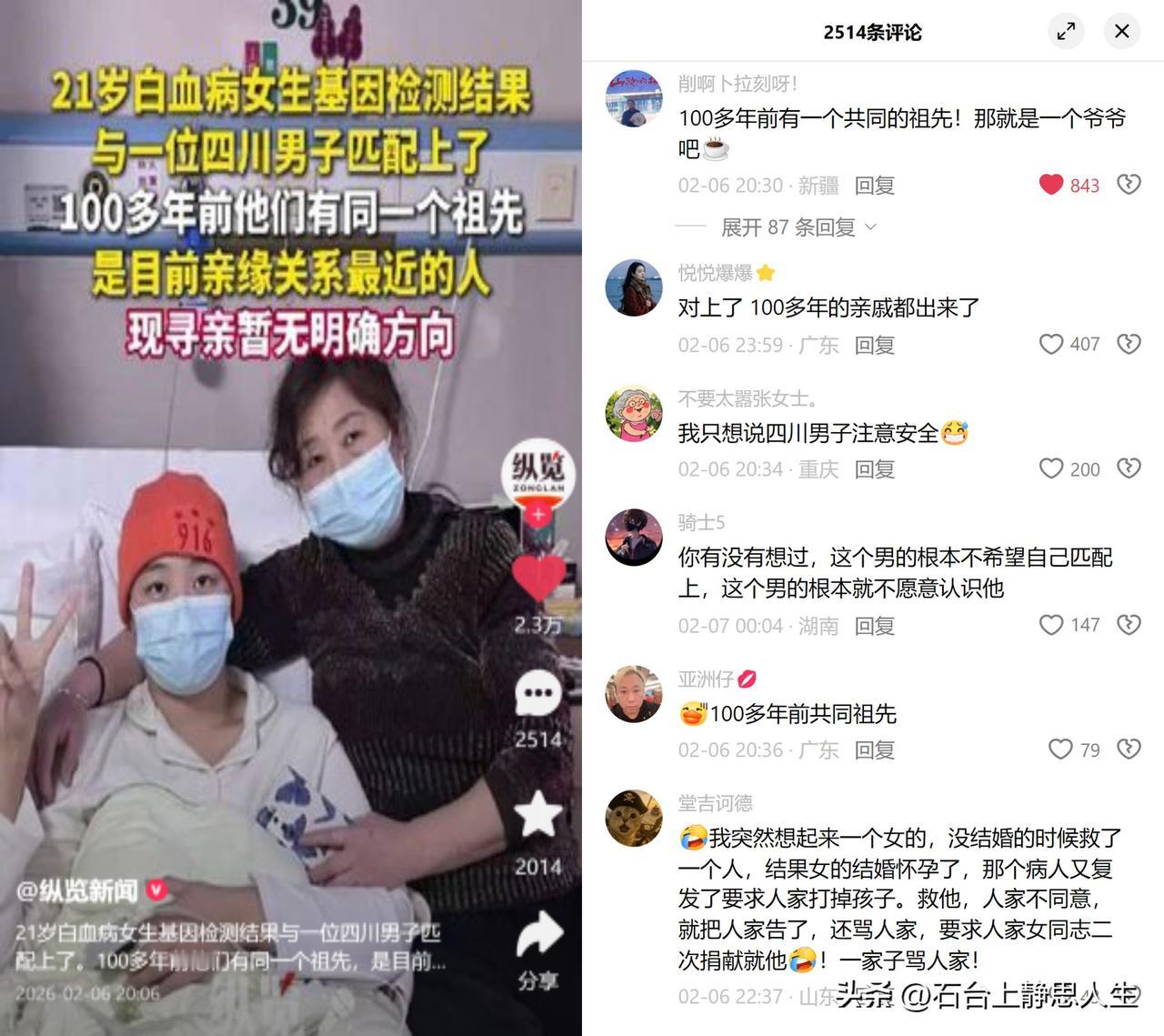 寻亲牵出百年亲缘,留言满是恐慌 21岁白血病女孩周和瑶,为找造血干细胞供者公开寻亲,基因检测匹配上一位有百年共祖的四川男子。本该是个求生的苗头,留言里却全是“四川男子注意安全”“别被逼捐”的担忧。 这份恐慌,源于大家对捐献法律边界普遍没搞清楚。不少人被过往模糊的传闻带偏,以为匹配上就有必须捐的义务,甚至会被起诉追责。但事实是,从《人体器官移植条例》到《民法典》都说得明明白白:捐献全程自愿,任何阶段都能反悔,没有强制执行的先例,连民事赔偿都谈不上。女孩的诉求也只是配型检测,没半点道德绑架的意思。 说白了,比起捐献,大家更怕被绑定。在信息碎片化的当下,很多人分不清道德鼓励和法定义务的边界,才会把一件求生的事,脑补成一场逼捐大戏。搞懂规则,才不会被情绪牵着走。