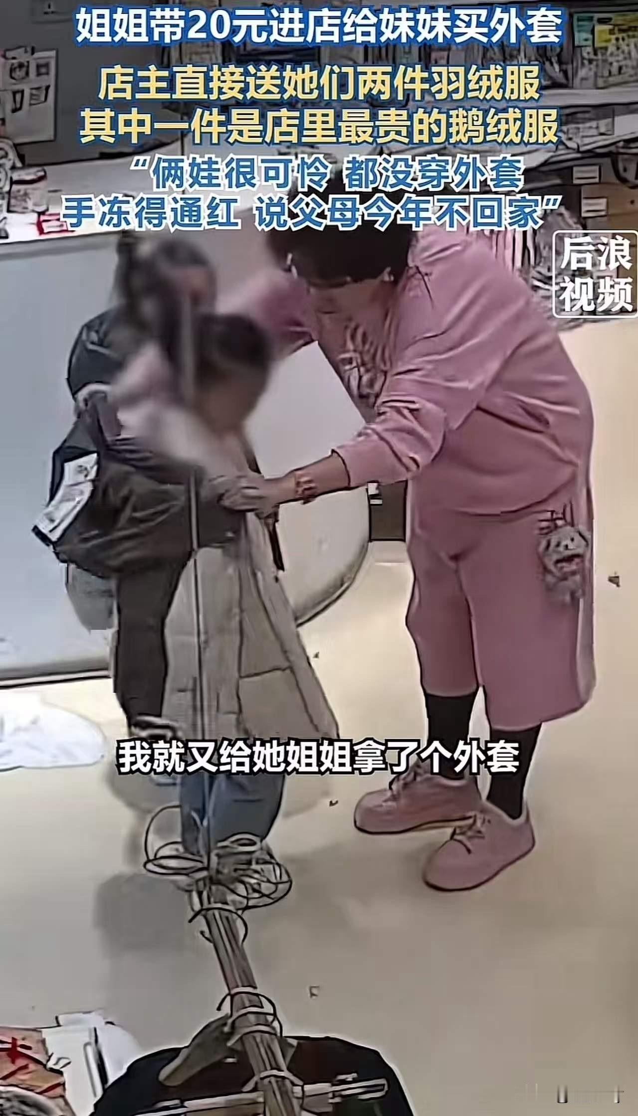 老板娘真是人美心善!天津的一家服装店里,六岁多的姐姐领着妹妹手里攥着20多块钱,来到这家服装店想给妹妹买一件厚一点的外套! 老板娘一家正在吃饭,看到两个小女孩进店,老板娘赶紧放下筷子过来招呼两个孩子! 姐姐把手里攥着皱巴巴的的20多块钱拿出来对着老板娘说:你好,我有20多块钱想给妹妹买一件外套,天气太冷了! 老板娘一看小姐俩穿得太薄了,大冷天谁都没穿羽绒服,小脸小手都冻红了很是心疼! 老板娘问小姐妹俩:你们的爸爸妈妈呢? 姐姐轻声地回答说:他们在外面打工,今年没有挣到钱,春节就不回来了!我想用我自己攒的钱给妹妹买一件新衣服! 老板娘听了这话,心里非常难受,自己也是当妈妈的人太心疼这两个孩子了! 老板娘转过身就从货架上拿了一件最暖和的羽绒服穿在了妹妹的身上,再回头看看姐姐身上也是一件薄薄的旧外套! 老板娘又拿了一件质量非常好的羽绒服套在了姐姐的身上,又给两个孩子每人拿了一副手套!把那攥得皱巴巴的20多块钱塞回了姐姐的兜里! 临走前两个孩子对着老板娘深深的鞠了一躬!感动的说着:谢谢阿姨! 老板娘犹如雪中送炭!为穿着单薄的姐妹俩送来了温暖!她的善举令人感动!祝福她善良美丽的老板娘!希望生意红红火火!