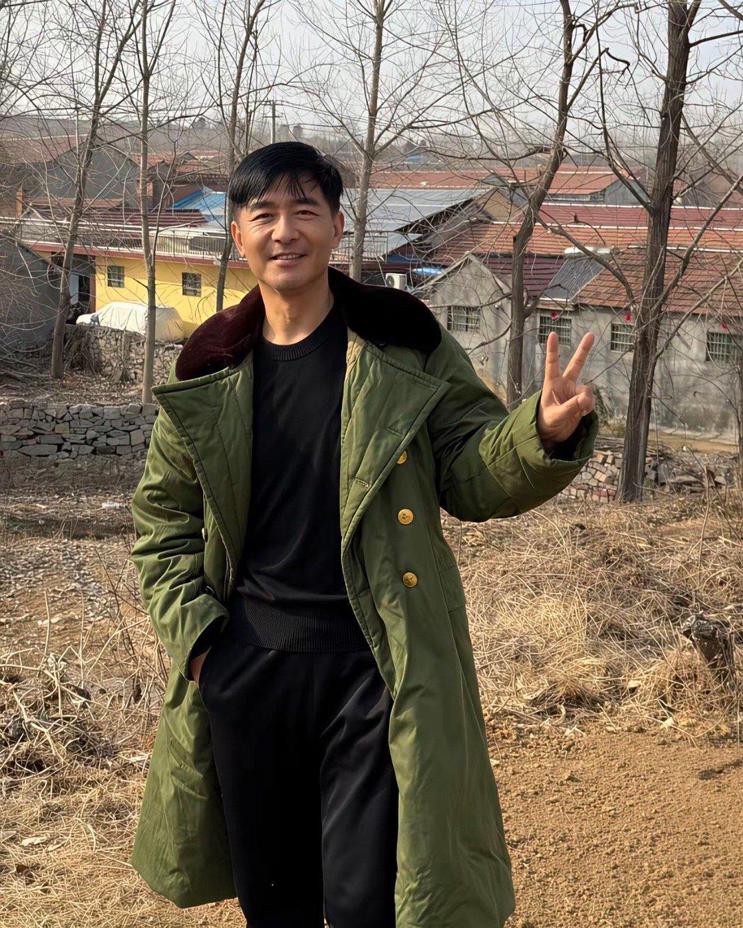 郭晓东和老婆程莉莎回老家山东临沂莒南坊前村过春节,他穿了军大衣棉袄,看起来好朴素,和旁边的程莉莎形成了鲜明对比。