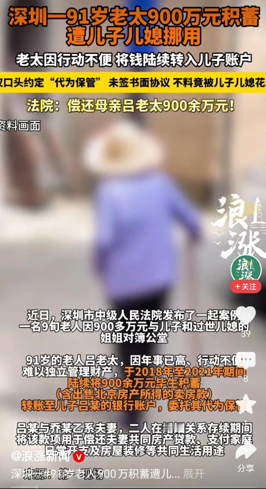 2024年,当91岁的吕老太拿着银行流水单质问儿子时,那个她含辛茹苦养大的男人,竟冷冷地回了一句:“妈,那是你给我的,怎么花是我的事。” 这句话像一把冰冷的尖刀,瞬间刺穿了老人最后的幻想。为了这句冷血的话,这位颤巍巍的老人不得不拄着拐杖走进法院,将亲生儿子和过世儿媳的姐姐推上被告席。只为了讨回那被儿子儿媳联手“吞掉”的900万养老钱。 这900多万,是吕老太一辈子的命根子。2018年到2021年间,年事已高的她为了省心,将出售北京房产所得的巨款,一笔一笔转入了儿子吕某的账户。她的初衷简单而纯粹:这是她最亲的人,把钱交给他,比放在银行更安全。她甚至从未想过要立下任何字据,因为在她心里,母子之间谈钱,那是对亲情的侮辱。 然而,现实却给了她一记响亮的耳光。 钱到了儿子手里,非但没有被“保管”,反而成了吕某夫妻小家庭的“金库”。偿还房贷、装修房子、日常开销……吕老太的毕生积蓄,就这样被悄无声息地“消化”在儿子的小家庭日常里。老人远在异地,对此一无所知,还在幻想着儿子孝顺、晚年安稳的画面。 2022年7月,儿媳乔某乙因病去世,这场精心掩盖的财务骗局终于露出了马脚。更让吕老太心寒的是,儿媳生前立下的遗嘱——那份遗嘱竟将300余万元的银行存款和房产份额,指定给了她的姐姐乔某甲。直到这时,吕老太才猛然惊醒:自己的钱没了,儿媳把钱留给了娘家人,而儿子,那个她寄予厚望的儿子,全程参与了这一切。 愤怒与绝望中,吕老太将儿子吕某和儿媳的姐姐乔某甲告上法庭。她要求儿子全额偿还,要求那个继承了儿媳遗产的姐姐在继承范围内承担责任。法庭上,昔日的亲情荡然无存,只剩下冰冷的利益纠葛。儿子辩称这是赠与,试图赖掉这笔账。 法院的判决,最终为这场闹剧画上了句号。法官一针见血地指出:将一位90岁老人的毕生积蓄推定为赠与,显然有违公平。最终,法院认定双方构成“保管合同关系”,吕某必须全额偿还母亲900余万元。而那位“捡漏”的姐姐,也必须在继承遗产的范围内承担清偿责任。 当法槌落下的那一刻,吕老太或许赢回了法律上的公道,但那份被金钱撕碎的亲情,却再也无法拼凑完整。这起案件,不仅是一个家庭的悲剧,更是一记警钟:父母的爱是无私的,但金钱是冰冷的。在巨额财富面前,没有契约的亲情,往往脆弱得不堪一击。