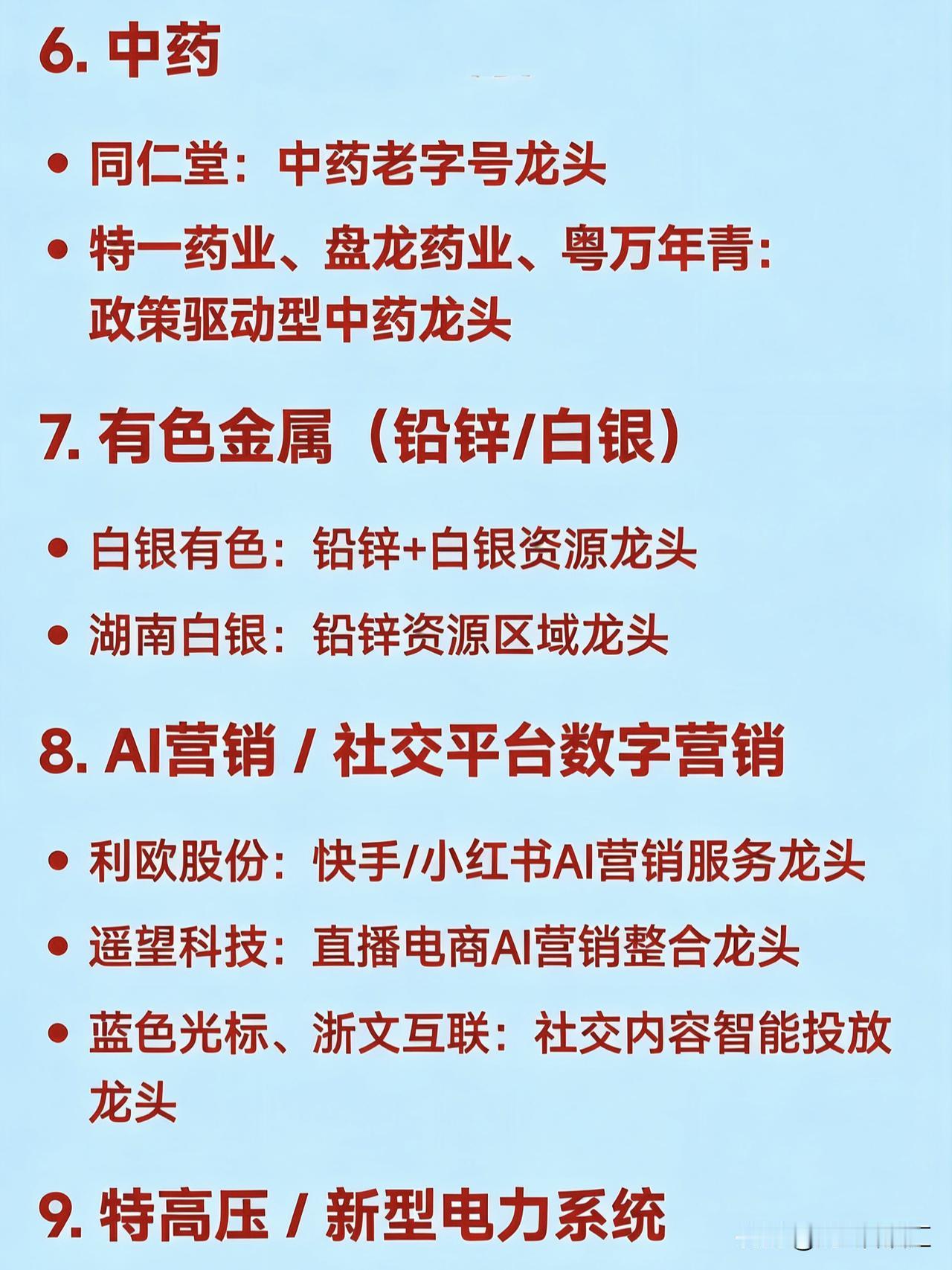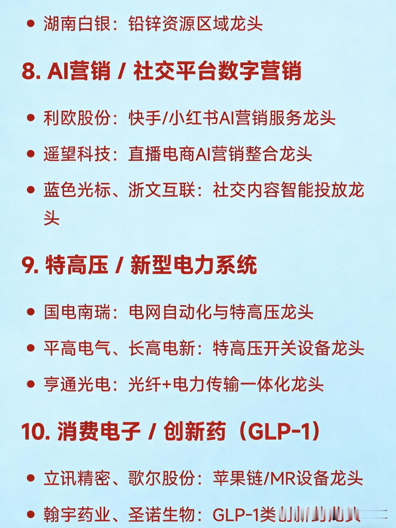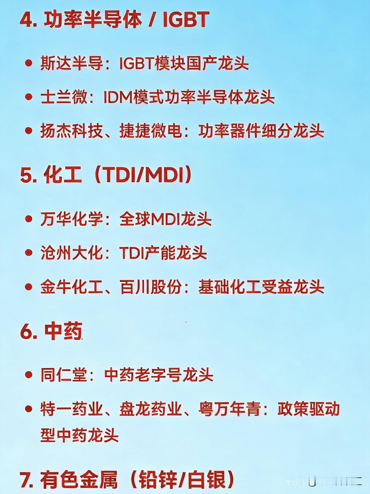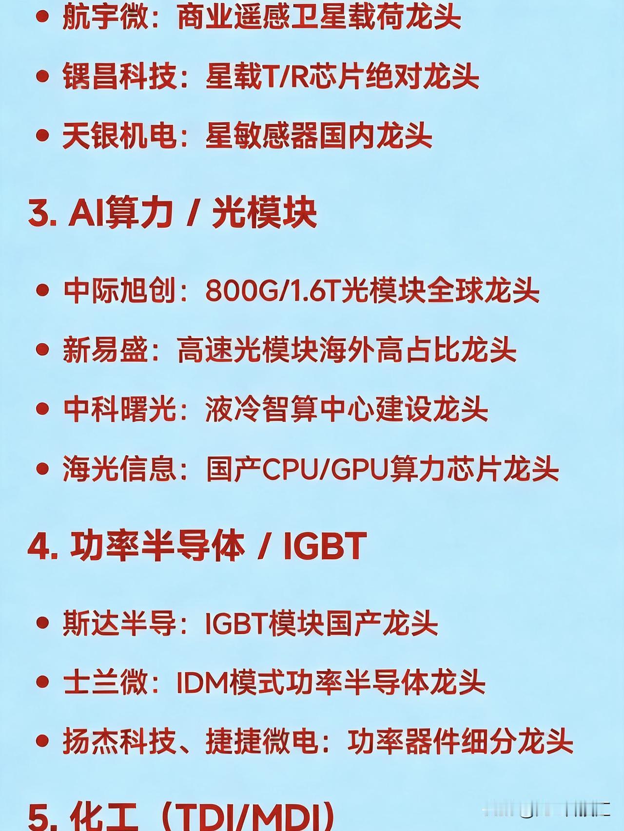 2026年2月7日,本周十大热点概念(热门科技龙头) 1. 太空光伏 / 钙钛矿电池 协鑫集成:钙钛矿叠层电池技术龙头 TCL中环:BC/TOPCon高效硅片与电池龙头 拓日新能:HJT及柔性光伏组件龙头 双良节能:光热+光伏设备一体化龙头 国晟科技:异质结(HJT)电池量产龙头 2. 商业航天 / 低轨卫星 巨力索具:火箭发射支撑系统龙头 航天发展:军工信息化与卫星通信龙头 航宇微:商业遥感卫星载荷龙头 铖昌科技:星载T/R芯片绝对龙头 天银机电:星敏感器国内龙头 3. AI算力 / 光模块 中际旭创:800G/1.6T光模块全球龙头 新易盛:高速光模块海外高占比龙头 中科曙光:液冷智算中心建设龙头 海光信息:国产CPU/GPU算力芯片龙头 4. 功率半导体 / IGBT 斯达半导:IGBT模块国产龙头 士兰微:IDM模式功率半导体龙头 扬杰科技、捷捷微电:功率器件细分龙头 5. 化工(TDI/MDI) 万华化学:全球MDI龙头 沧州大化:TDI产能龙头 金牛化工、百川股份:基础化工受益龙头 6. 中药 同仁堂:中药老字号龙头 特一药业、盘龙药业、粤万年青:政策驱动型中药龙头 7. 有色金属(铅锌/白银) 白银有色:铅锌+白银资源龙头 湖南白银:铅锌资源区域龙头 8. AI营销 / 社交平台数字营销 利欧股份:快手/小红书AI营销服务龙头 遥望科技:直播电商AI营销整合龙头 蓝色光标、浙文互联:社交内容智能投放龙头 9. 特高压 / 新型电力系统 国电南瑞:电网自动化与特高压龙头 平高电气、长高电新:特高压开关设备龙头 亨通光电:光纤+电力传输一体化龙头 10. 消费电子 / 创新药(GLP-1) 立讯精密、歌尔股份:苹果链/MR设备龙头 翰宇药业、圣诺生物:GLP-1类创新药龙头