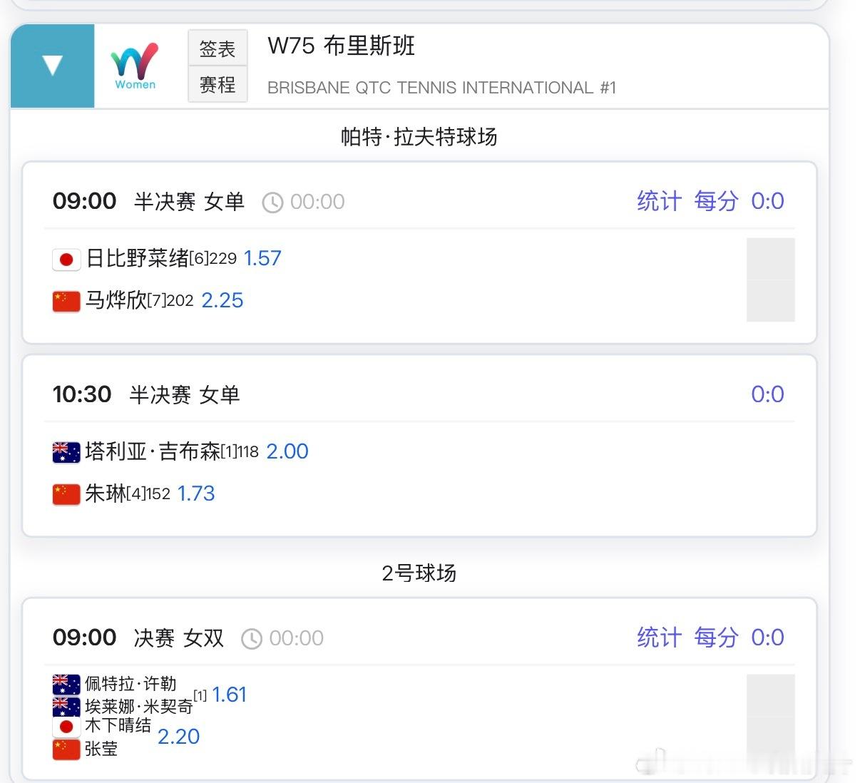 🔵W75布里斯班女单半决赛/女双决赛09:00🇨🇳马烨欣vs🇯🇵日比野菜绪随后🇨🇳朱琳vs🇦🇺吉布森09:00🇨🇳张莹组合冲击冠军
