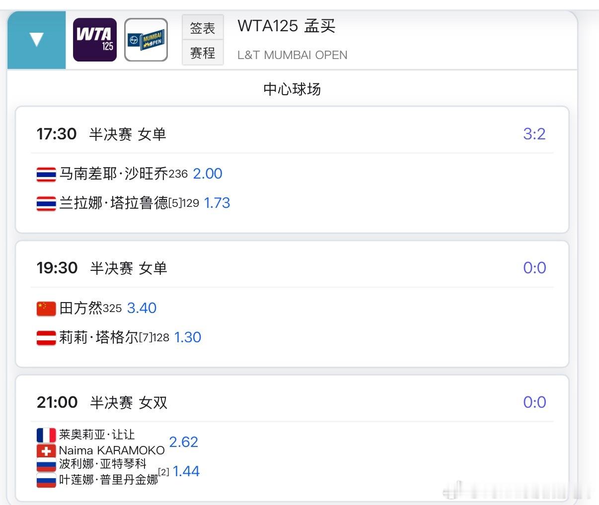 🔵WTA125孟买女单半决赛19:30 🇨🇳田方然vs🇦🇹塔格尔