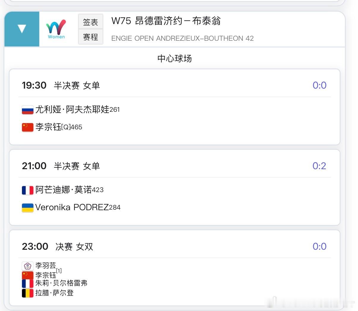 🔵W75昂德雷济约女单半决赛/女双决赛19:30 🇨🇳李宗钰23:00 🇨🇳李宗钰女双
