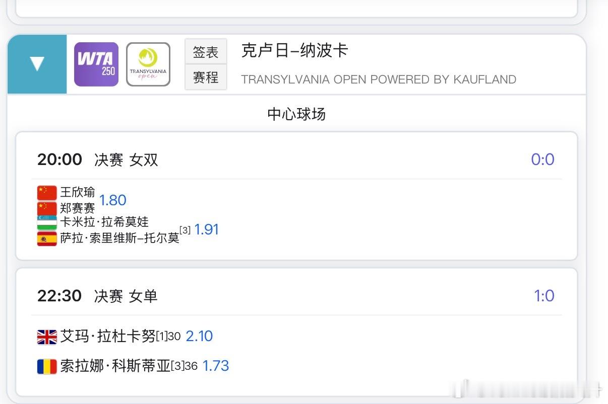 🔵WTA250克卢日纳波卡女双决赛20:00🇨🇳王欣瑜/郑赛赛vs🇪🇸托莫/🇺🇿拉希莫娃