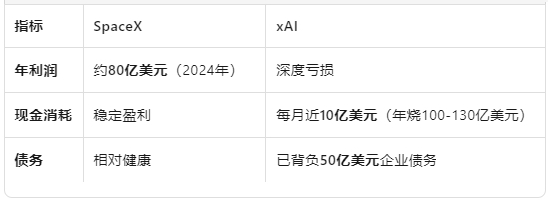 为此,马斯克炒作“太空算力”、“太空发电”、“100万颗卫星”,真实目的是让SpaceX为xAI的巨额资本需求买单。xAI烧钱实在太厉害了,每个月10亿美元,没有来钱的办法。
