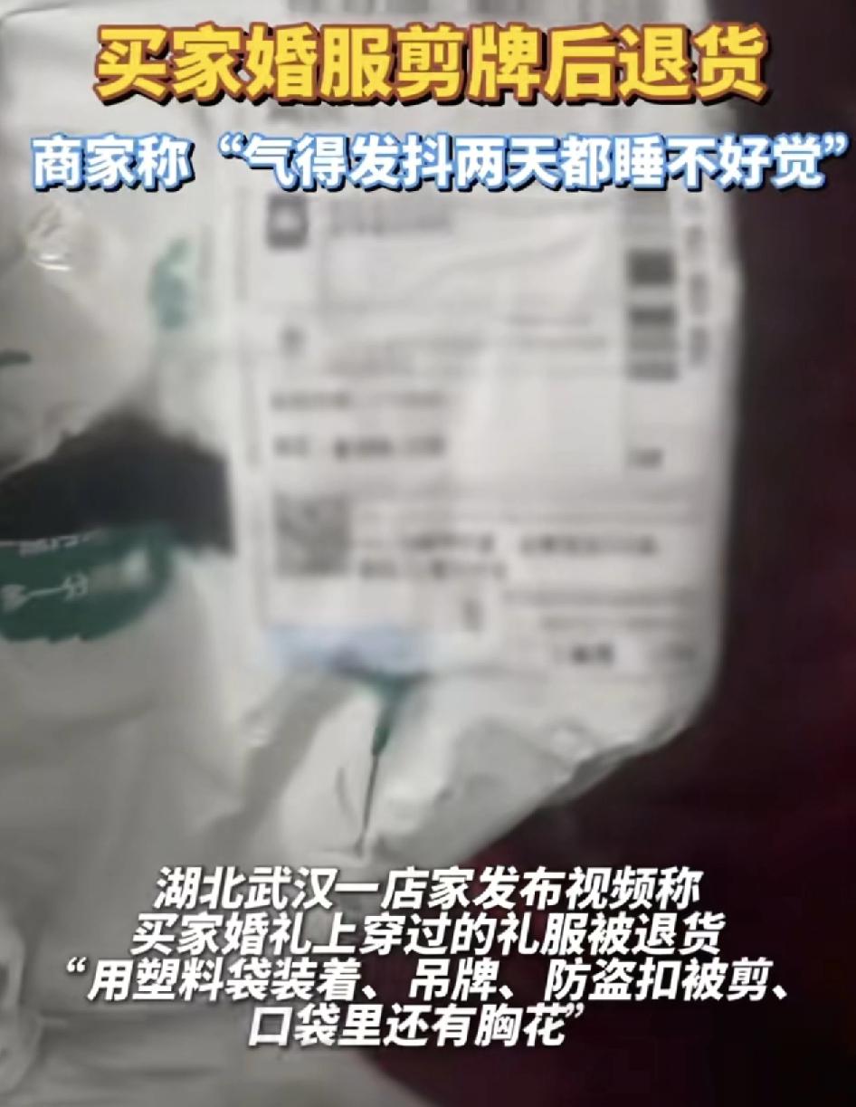 湖北武汉一网店商家收到一客人的退货,发现已经是签收20天退回来穿过的婚礼服。衣服的吊牌和防盗扣已经被剪了,口袋里还有胸花,客户以质量问题申请退款,商家被气得两天都睡不着,于是公开视频曝光对方。商家称这件衣服已经不能二次销售了,曝光视频也是为了争口气。