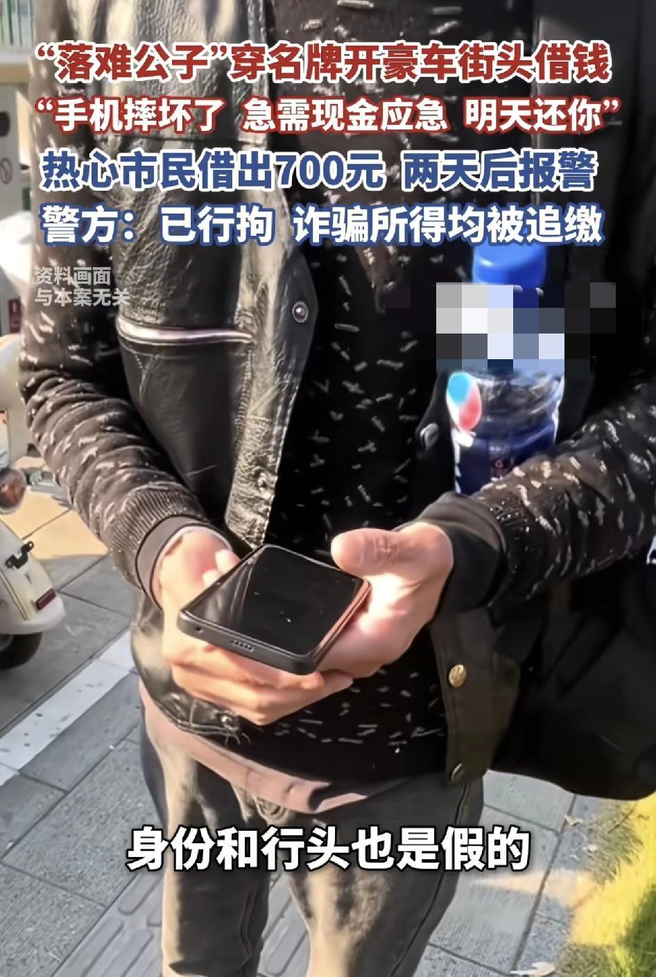 上海一家超市旁边一名男子开着豪车,将路人拦下,声称自己是某国企员工,车子坏掉了,手机砸坏了,想借点钱急用,改天就还钱,出于同情的路人把他带回家中,取出700元借给男子,但是两年过去了,意识到不对劲的路人,这时才感觉到自己被骗了,于是选择报警,被抓获时男子承认自己的车是借过来的,手机是故障机。不少网友称,这样的套路已经几十年就出现过了。