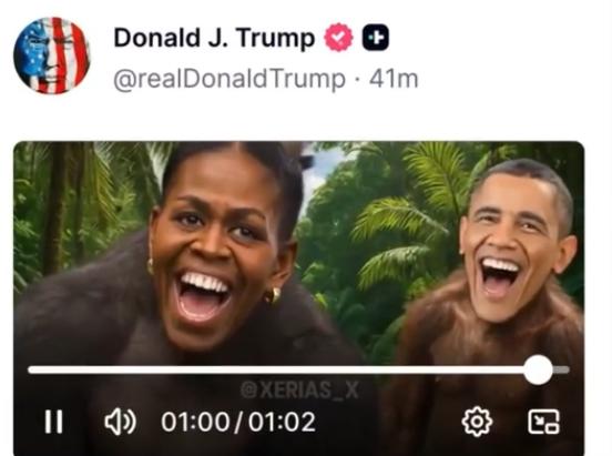 特朗普又整出幺蛾子,这次直接踩爆美国种族红线,不仅民主党集体怒怼,连共和党自己人都看不下去,全美上下骂声一片。 2月5日深夜1特朗普在个人社交平台发了条1分钟视频,前面看着平平无奇,结尾却让人怒到发抖。 奥巴马夫妇的面部被直接拼接在灵长类动物的身体上,视频背景还配着《狮子王》的背景音乐,里面还夹杂着2020年大选投票机遭篡改的不实言论 当视频刚发出去互动量一路猛涨,可随之而来的是铺天盖地的指责和怒骂。 更让人无语的是白宫的一波操作堪称大型甩锅现场,一开始白宫新闻秘书还硬气辩解,说视频压根没冒犯意思,反倒指责外界故意挑事、虚假愤怒。 没熬多久就赶紧改口,把锅甩给白宫工作人员,说是操作失误误发的,还悄悄把这段争议视频删掉了,此时距离视频发布已经过去十几个小时了。 但特朗普本人更是把责任推得一干二净,声称自己只看了视频前半段,没看到冒犯画面,即便嘴上说谴责种族主义内容,却死活不肯道歉,还硬邦邦说自己“没犯错”。 这波操作直接惹怒了全美各界,就连共和党内部都出现了反对声音,参议院唯一的非裔共和党参议员直言,这是他见过白宫干的最种族歧视的事,还有共和党议员要求删帖并公开道歉。 不仅如此,民主党这边更是全员发声声讨,前副总统更是直接戳穿白宫的谎言,直言没人会相信这套明显百般狡辩的说法。 除此以外,美国全国有色人种协进会主席更是痛批,这就是公然的种族歧视,让人作呕又愤怒。 但凡了解美国的人都知道,把黑人和猿猴绑定,是刻在骨子里的种族侮辱,这是所有人都心知肚明的红线。 作为一国总统,自己的社交平台发布这样的内容,一句“误发”就想轻飘飘揭过?白宫前后矛盾的回应,特朗普拒不认错的态度,根本就是不负责任的表现。