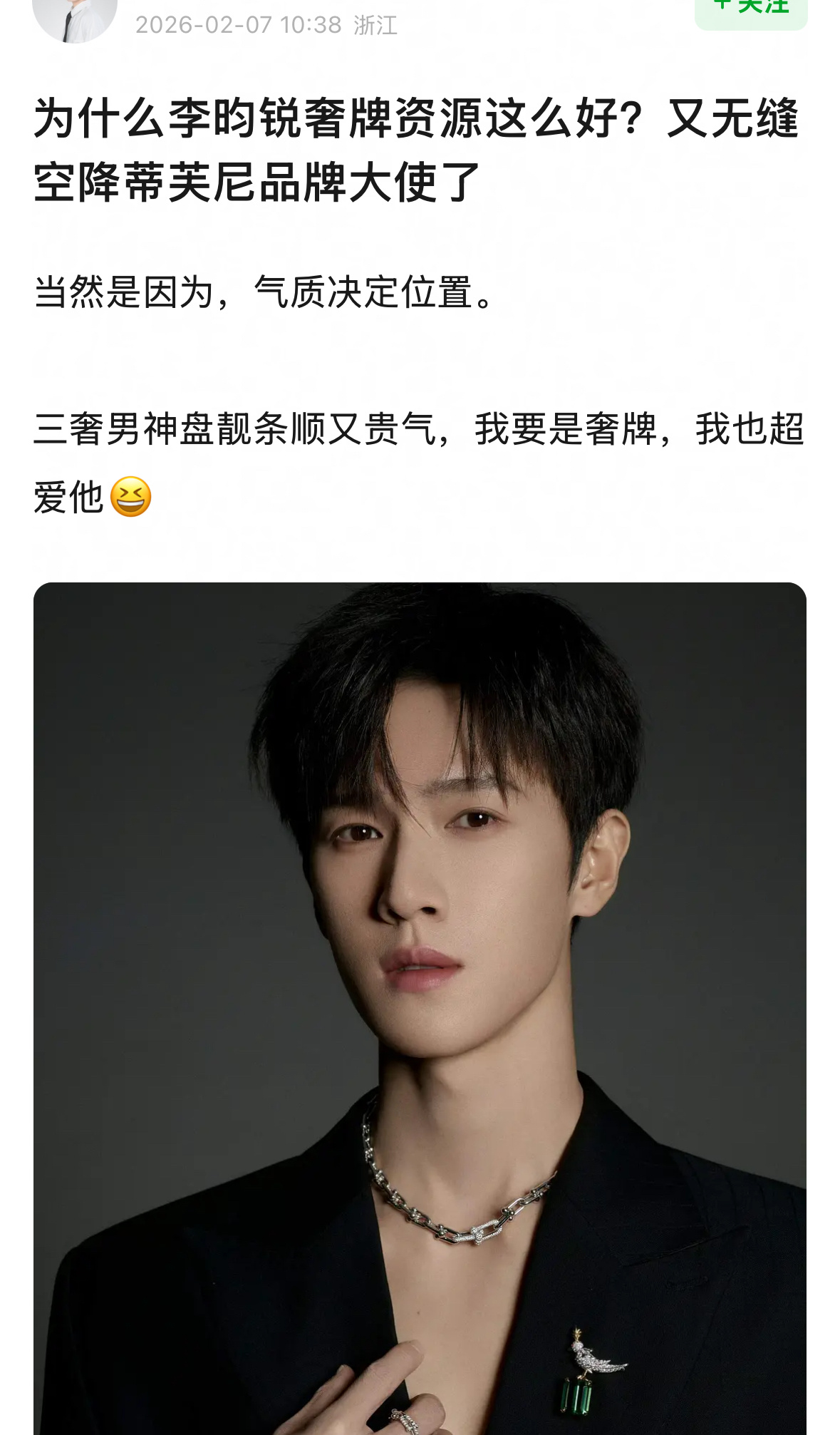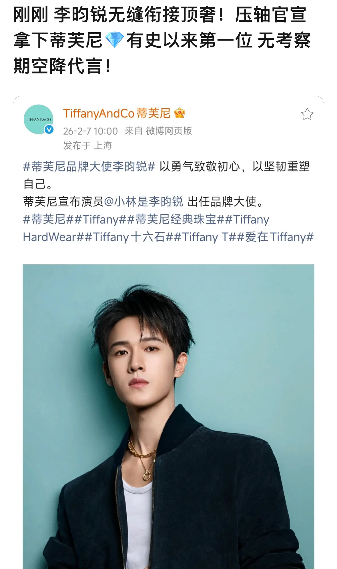 李昀锐蒂芙尼官宣了,无考察空降压轴官宣,有史以来第一位。小林已经手握两大顶奢。