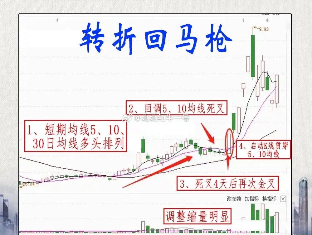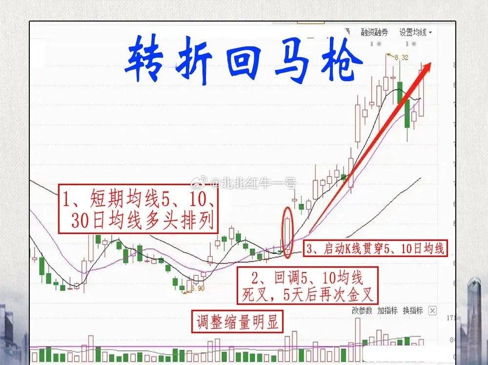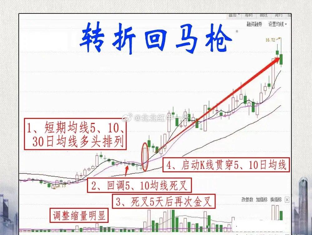 主力拉升前必做快速洗盘,K线必会留下上涨回马枪痕迹,这是底部反转核心信号,短线朋友必看!上涨回马枪多现于上涨初期,均线整体多头,主力短暂洗盘让5/10日线临时死叉,调整3-7天且不破30日均线,一旦出现一阳穿两线,就是二次启动的明确信号!