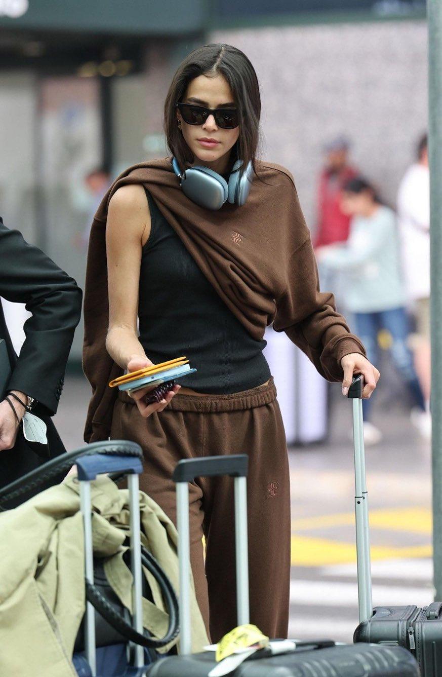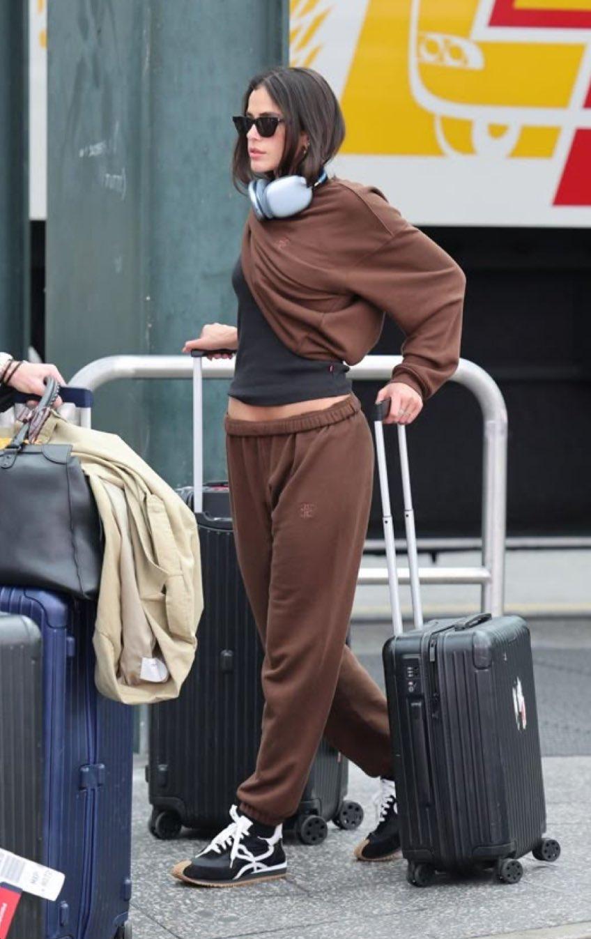 巴西女演员布鲁娜·马尔奎辛抵达机场时的狗仔队照片。照片中,她身穿一套棕色运动服、黑色短款上衣和一件披肩式连帽衫,将随意的旅行装扮演绎成了令人艳羡的时尚大片。 巧妙地将“凌乱”的抓拍照片与堪比时尚大片的照片进行对比,她毫不费力的时尚风格在葡萄牙语社区引发了广泛赞誉。