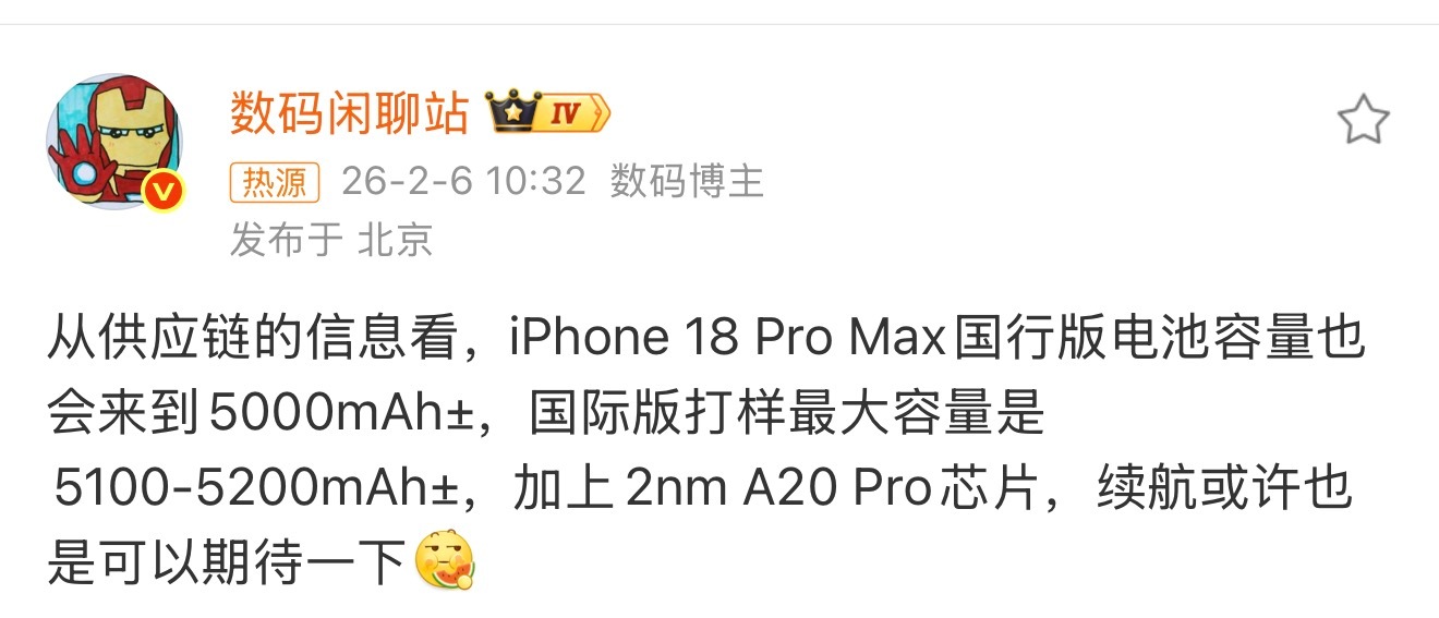 iPhone18 Pro Max的电池达到了5000毫安时以上。